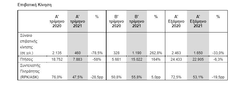 Κατά το δεύτερο τρίμηνο η πτητική δραστηριότητα του Ομίλου παρέμεινε σε χαμηλά επίπεδα, ήτοι μόλις στο 35% της αντίστοιχης δραστηριότητας του 2019 σε χιλιομετρικές θέσεις, με σημαντική αύξηση όμως συγκριτικά με το 2020. Πιο συγκεκριμένα, ο Όμιλος πραγματοποίησε 15,000 πτήσεις με την επιβατική κίνηση να ανέρχεται στους 1,2 εκατ. επιβάτες.