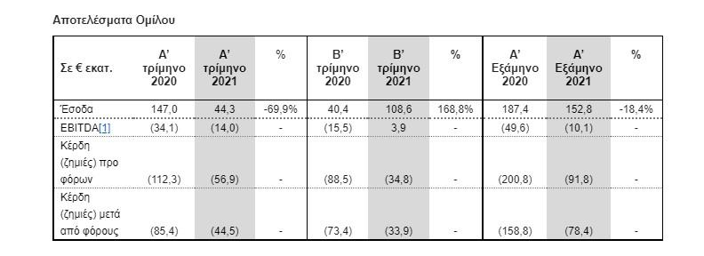Στο πρώτο εξάμηνο ο κύκλος εργασιών κατέγραψε μείωση 18,4% και ανήλθε σε €152,8 εκατ., ενώ οι καθαρές ζημιές μετά από φόρους ανήλθαν σε €78,4 εκατ., από €158,8 εκατ. το πρώτο εξάμηνο του 2020.