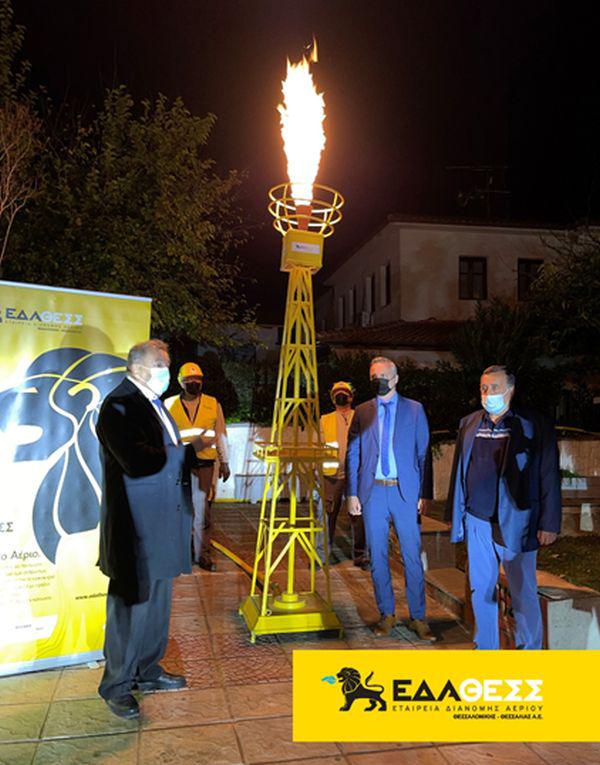 Στο πλαίσιο αυτό, πραγματοποιήθηκε συμβολική αφή φλόγας για την έναρξη τροφοδότησης του δικτύου διανομής από τον Δήμαρχο Θέρμης, κ. Θεόδωρο Παπαδόπουλο, τον Διευθυντή Ανάπτυξης Αγοράς Φυσικού Αερίου της ΕΔΑ ΘΕΣΣ, κ. Μιχάλη Στεργιόπουλο και τα στελέχη της Εταιρείας.