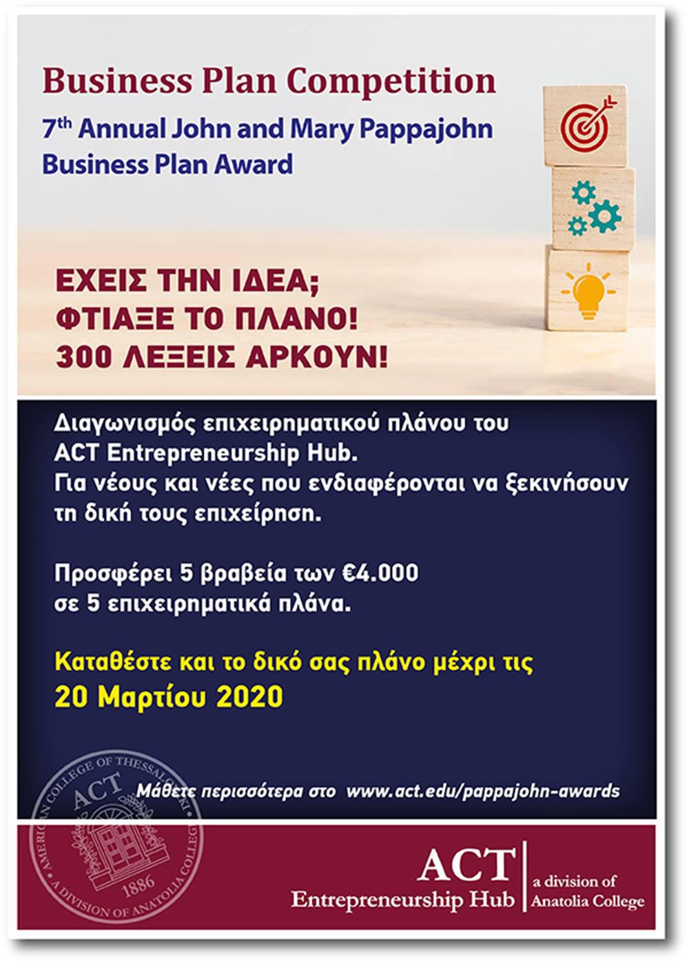 Με στόχο την ενίσχυση των νέων επιχειρηματιών που επιθυμούν να ξεκινήσουν τη δική τους επιχείρηση, πραγματοποιείται για έβδομη συνεχή χρονιά ο Διαγωνισμός Επιχειρηματικών Ιδεών «John & Mary Pappajohn Business Plan Competition». Ο Διαγωνισμός διοργανώνεται από το Κέντρο Επιχειρηματικότητας του ACT- American College of Thessaloniki και θα απονείμει πέντε βραβεία 4.000 ευρώ σε κάθε ένα από τα πέντε καλύτερα επιχειρηματικά πλάνα. Τα χρηματικά έπαθλα προσφέρει ο ελληνικής καταγωγής επιχειρηματίας John Pappajohn.