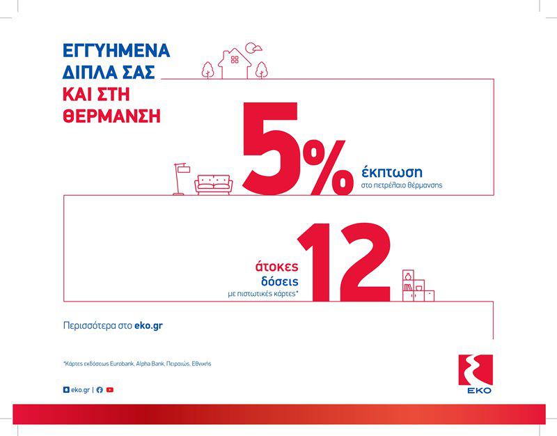 Για ακόμη μία χρονιά, η ΕΚΟ κατανοώντας τις ανάγκες της εποχής, παραμένει έμπρακτα δίπλα στους Έλληνες καταναλωτές, δίνοντάς τους τη δυνατότητα να προμηθευτούν πετρέλαιο θέρμανσης με έκπτωση 5% και εξόφληση σε 12 άτοκες δόσεις με πιστωτικές κάρτες ελληνικών τραπεζών1.