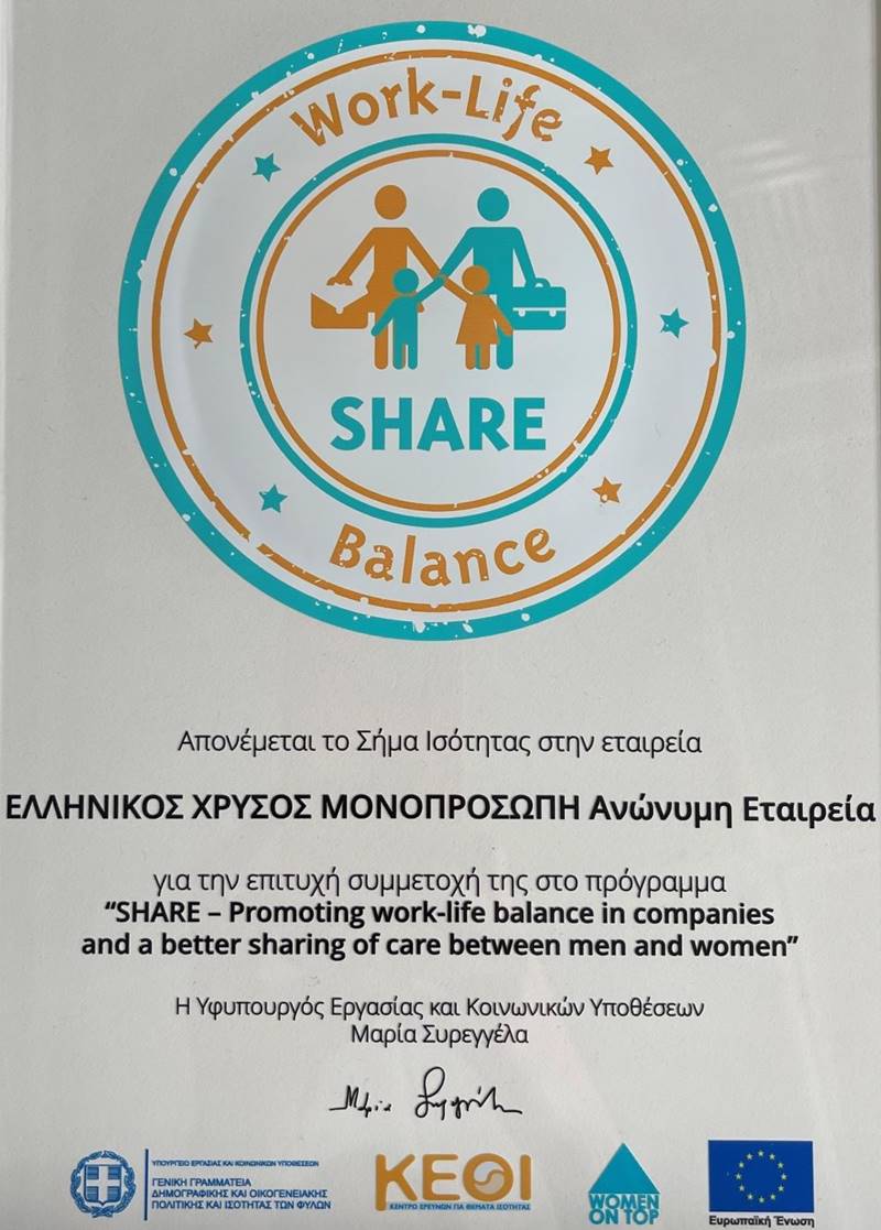 Ανάμεσα στις πρώτες δεκαοκτώ (18) επιχειρήσεις που έλαβαν το Σήμα Ισότητας SHARE του Υπουργείου Εργασίας βρίσκεται η Ελληνικός Χρυσός, η οποία ανταποκρίθηκε με επιτυχία στα κριτήρια αξιολόγησης και απέσπασε τη θετική εισήγηση της ανεξάρτητης Επιτροπής Αξιολόγησης, που υλοποιεί το ευρωπαϊκό πρόγραμμα στην Ελλάδα.