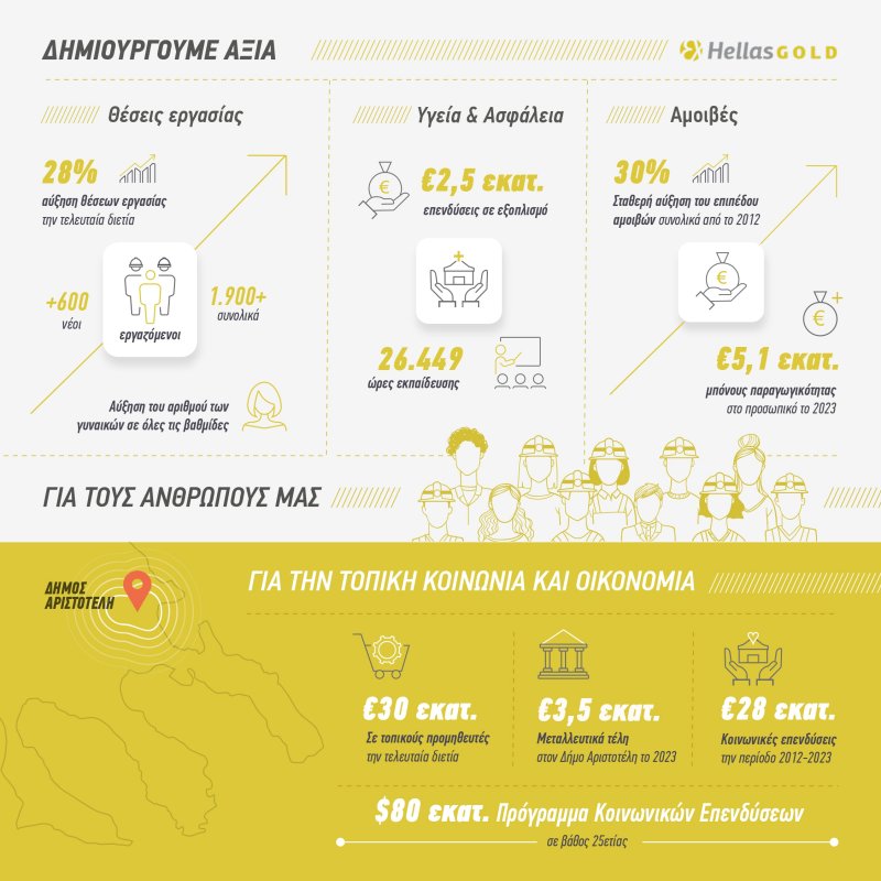Εξίσου σημαντικό είναι και το αποτύπωμα της Ελληνικός Χρυσός στην απασχόληση. Συνολικά, απασχολεί σήμερα περισσότερους από 1.900 εργαζόμενους, έχοντας σημειώσει από το 2022, 28% αύξηση σε θέσεις εργασίας. Αξίζει να σημειωθεί ότι 9 στους 10 εργαζόμενους στην εταιρεία προέρχεται από την τοπική κοινωνία, καθώς η εταιρεία δίνει διαχρονικά προτεραιότητα στο ντόπιο δυναμικό, ενώ περίπου το 50% των εργολαβικά απασχολούμενων στην κατασκευή του έργου των Σκουριών έχουν μετεγκατασταθεί μόνιμα στην περιοχή.