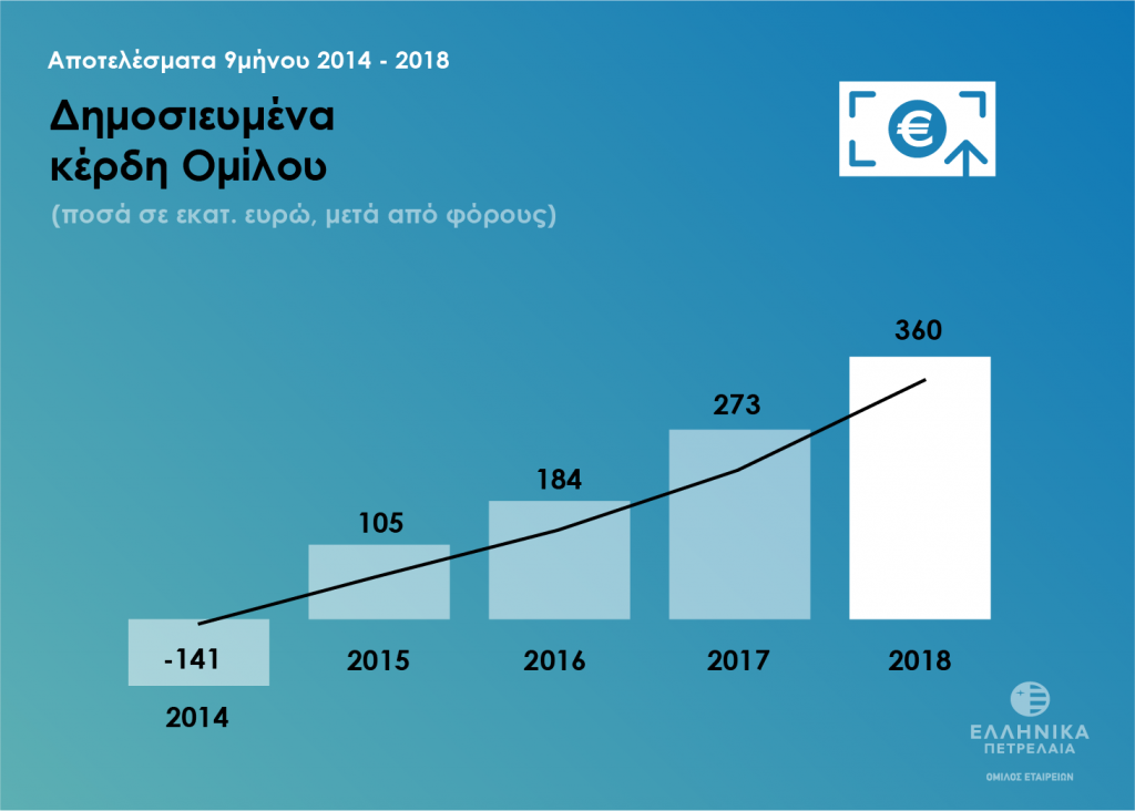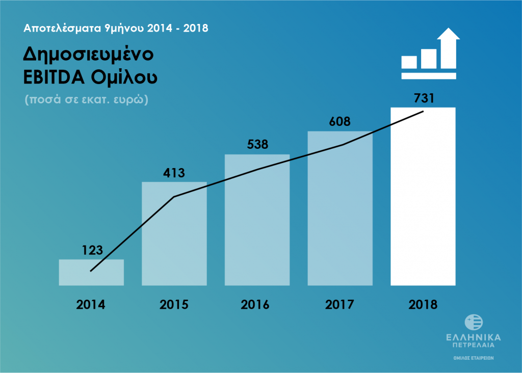 Το 2018 θα αποτελέσει έτος – ορόσημο για την ανοδική και διαχρονικά πλέον σταθερή κερδοφόρα πορεία του Ομίλου ΕΛΛΗΝΙΚΑ ΠΕΤΡΕΛΑΙΑ, με τα ιδιαίτερα θετικά αποτελέσματα Γ’ Τριμήνου – Εννεαμήνου 2018 να δημιουργούν ακόμη ένα ισχυρό θεμέλιο για το μέλλον. Τα δημοσιευμένα κέρδη EBITDA Εννεαμήνου διαμορφώθηκαν στα €731 εκατ. καταγράφοντας άνοδο 20% σε σχέση με πέρσι, ενώ τα δημοσιευμένα καθαρά κέρδη αυξήθηκαν κατά 32% στα €360 εκατ., τα υψηλότερα που έχουν καταγραφεί.