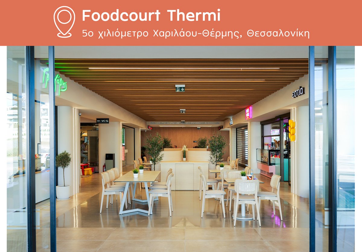 Το νέο Foodcourt Thermi βρίσκεται στο 5ο χιλιόμετρο Χαριλάου-Θέρμης, σε μία από τις πιο γρήγορα αναπτυσσόμενες περιοχές της Θεσσαλονίκης. Φιλοξενεί 8 διαφορετικά και αγαπημένα, στους καταναλωτές, concepts φαγητού και είναι σχεδιασμένο έτσι ώστε κάθε γωνιά να έχει τη δική της ταυτότητα.