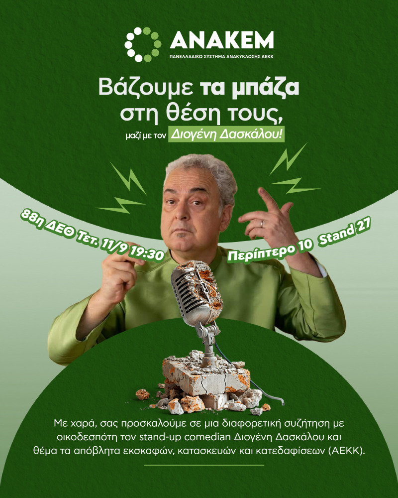 Την Τετάρτη 11 Σεπτεμβρίου, στις 19.30, η ΑΝΑΚΕΜ σας προσκαλεί σε μια διαφορετική συζήτηση για την ανακύκλωση των ΑΕΚΚ μαζί με τον γνωστό stand-up comedian Διογένη Δασκάλου.