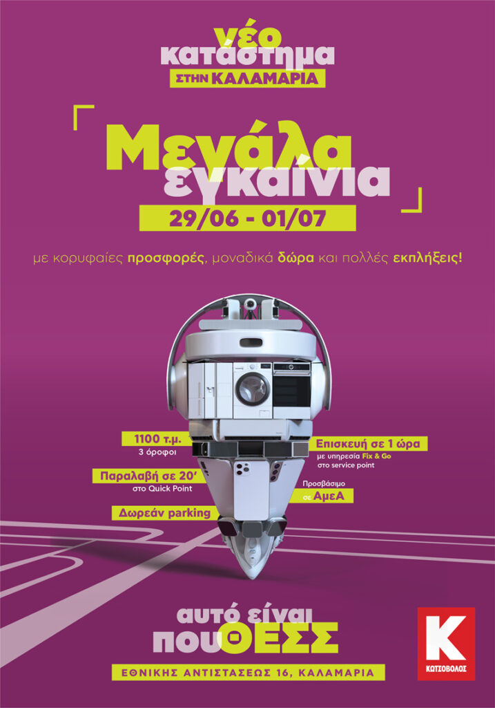 Η Κωτσόβολος, κορυφαίος προορισμός τεχνολογίας, ενισχύει την παρουσία της στη Θεσσαλονίκη και εγκαινιάζει ένα ακόμα κατάστημα, αυτή τη φορά στην Καλαμαριά. Από την Πέμπτη 29/06 μέχρι και το Σάββατο 01/07, σε προσκαλεί στα μεγάλα εγκαίνια του νέου καταστήματος με κορυφαίες προσφορές, διαγωνισμούς με πλούσια δώρα και πολλές εκπλήξεις.