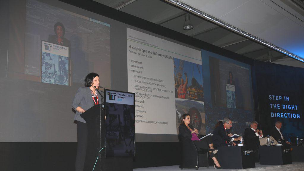 Θεσσαλονίκη, Ελλάδα. Την πρόοδο των έργων για την κατασκευή του Διαδριατικού Αγωγού Φυσικού Αερίου (TAP AG) παρουσίασε η Διευθύντρια του ΤΑΡ για την Ελλάδα, κ. Κατερίνα Παπαλεξανδρή, στο 2o Thessaloniki Summit που διεξήχθη στις 5 και 6 Οκτωβρίου στο Βελλίδειο Συνεδριατικό Κέντρο.