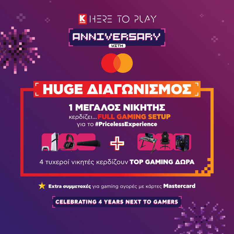 Η καμπάνια “Here to Play Anniversary with Mastercard”, έχει ήδη ξεκινήσει με μεγάλο online διαγωνισμό, ο οποίος διεξάγεται ήδη και θα ολοκληρωθεί στις 8 Ιανουαρίου. Ο πρώτος μεγάλος νικητής θα κερδίσει ένα full gaming set up για μια ανεκτίμητη εμπειρία που θα μπορέσει να ζήσει στο χώρο του σπιτιού του, ενώ άλλοι 4, στο πλαίσιο του εορτασμού των 4 χρόνων, θα κατακτήσουν κορυφαία gaming δώρα. Κάθε επιπλέον αγορά με κάρτες Mastercard αυξάνει τις συμμετοχές και ταυτόχρονα τις πιθανότητες για νίκη*.