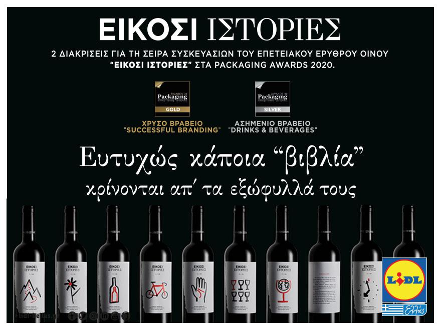 – Gold βραβείο στην κατηγορία «Έργα και Πρακτικές που επιδεικνύουν υψηλή δεξιοτεχνία, αξιοποίηση της τεχνολογίας, δημιουργικότητα και πρωτοτυπία» για τη συσκευασία του επετειακού ερυθρού οίνου ιδιωτικής ετικέτας «Είκοσι Ιστορίες», η οποία δημιουργήθηκε με αφορμή τον εορτασμό της Lidl Ελλάς για τα 20 χρόνια δραστηριοποίησής της στην Ελλάδα και επιμελήθηκε η Caparo Design Crew. Κάθε ετικέτα παραπέμπει σε μία συμβολική ιστορία εμπνευσμένη από τον ελληνικό τόπο, τις ομορφιές, τις ιδιομορφίες του και φυσικά τις ιστορίες του.