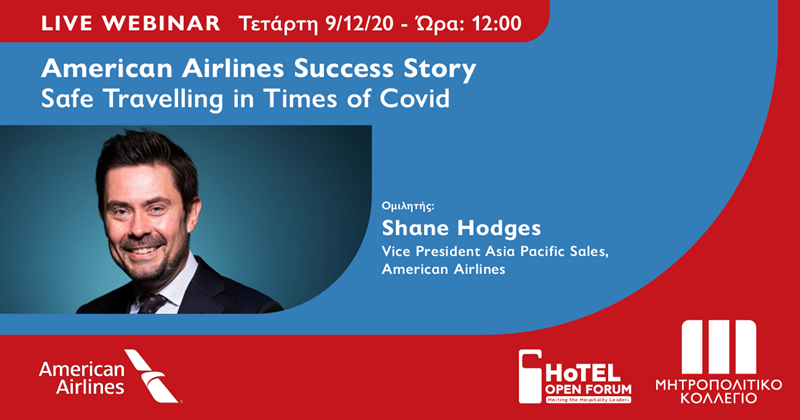 Tο Μητροπολιτικό Κολλέγιο υποδέχεται διαδικτυακά, για πρώτη φορά στην Ελλάδα, τον Αντιπρόεδρο της American Airlines, Shane Hodges, την Τετάρτη 9 Δεκεμβρίου στις 12:00. Ο κος Hodges – Vice President Asia Pacific Sales, American Airlines – θα είναι ο κεντρικός ομιλητής στο Live Webinar με τίτλο: