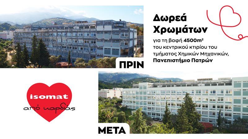 Η ISOMAT προχώρησε στη δωρεά χρωμάτων προς το Πανεπιστήμιο Πατρών για τη βαφή των προσόψεων του κεντρικού κτιρίου του Τμήματος Χημικών Μηχανικών, συνολικής έκτασης 4.500 τ.μ., με στόχο την αισθητική αναβάθμιση του κτιρίου για τους φοιτητές, το προσωπικό αλλά και την τοπική κοινωνία.