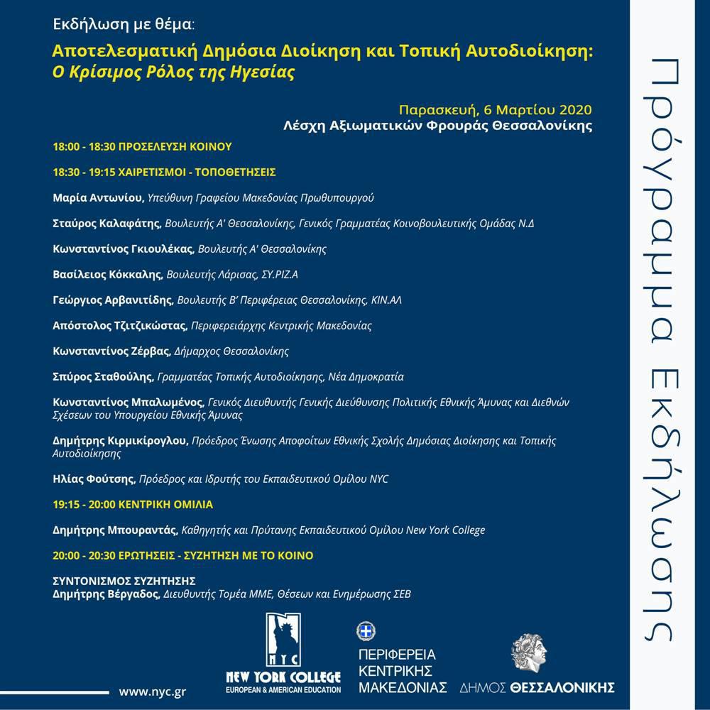 O Εκπαιδευτικός Όμιλος New York College, υπό την Αιγίδα της Περιφέρειας Κεντρικής Μακεδονίας και του Δήμου Θεσσαλονίκης και με την επίσημη υποστήριξη της Ένωσης Αποφοίτων Εθνικής Σχολής Δημόσιας Διοίκησης και Τοπικής Αυτοδιοίκησης, πραγματοποιεί Εκδήλωση με θέμα: