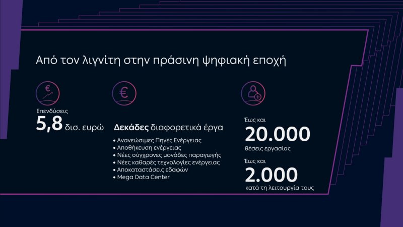 Ο Όμιλος ΔΕΗ θα υλοποιήσει συνολικά δεκάδες έργα στη Δυτική Μακεδονία που θα δημιουργήσουν έως και 20.000 θέσεις εργασίας κατά την κατασκευή και έως 2,000 θέσεις κατά τη λειτουργία σε πλήρη ανάπτυξη όλων των σχεδίων.
