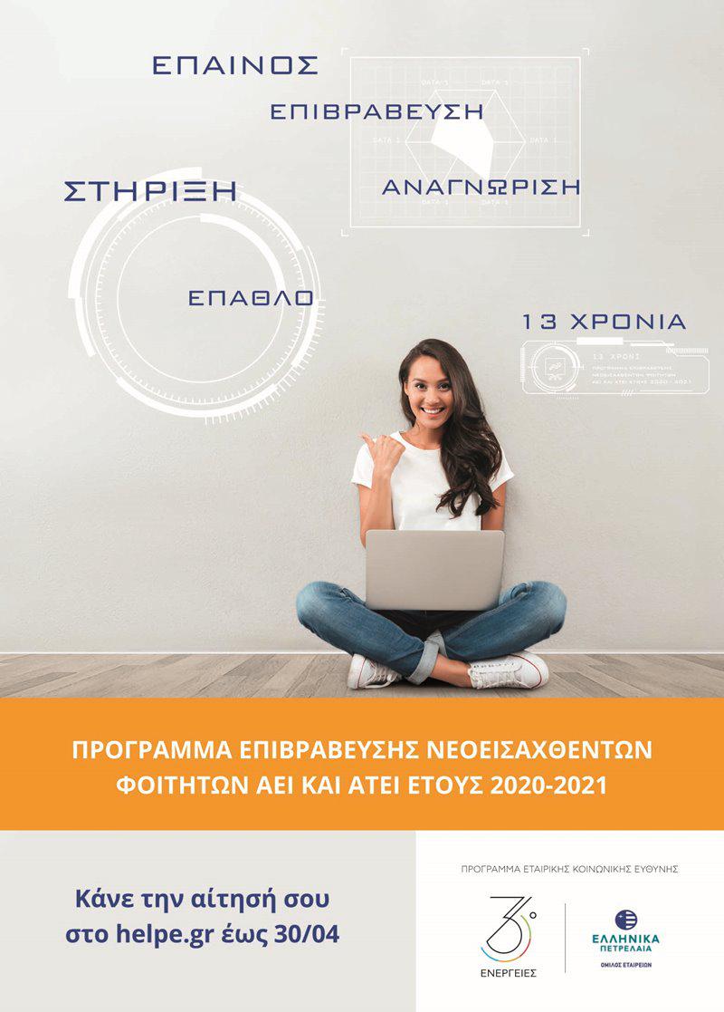 Ο Όμιλος ΕΛΛΗΝΙΚΑ ΠΕΤΡΕΛΑΙΑ, στο πλαίσιο του Προγράμματος Εταιρικής Κοινωνικής Ευθύνης «360ο Ενέργειες», επιβραβεύει για 13η συνεχή χρονιά, τους νεοεισαχθέντες φοιτητές στην Τριτοβάθμια Εκπαίδευση κατά το ακαδημαϊκό έτος 2020-2021.