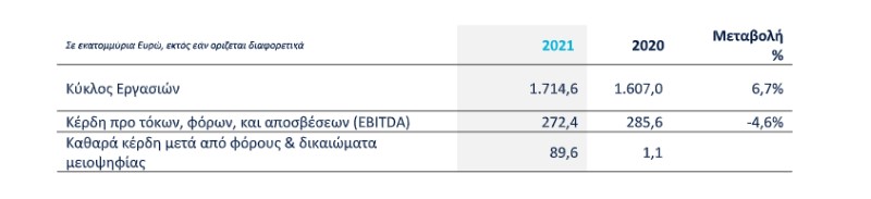 - Τα κέρδη προ τόκων, φόρων, και αποσβέσεων (EBITDA) μειώθηκαν κατά 4,6% σε €272,4 εκ. λόγω της πρωτοφανούς αύξησης του κόστους το δεύτερο εξάμηνο του έτους Τα καθαρά κέρδη μετά από φόρους και δικαιώματα μειοψηφίας (NPAT) αυξήθηκαν σε €89,6 εκ. (έναντι €1,1 εκ. μετά τις εφάπαξ χρεώσεις €63,9 εκ. το 2020 και €50,9 εκ. το 2019), κυρίως χάρη στην επιτυχή αναχρηματοδότηση του δανεισμού και τις ευνοϊκότερες συναλλαγματικές διακυμάνσεις.