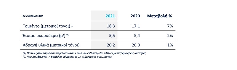 Όπως προαναφέρθηκε οι τάσεις των εγχώριων πωλήσεων ήταν θετικές σε όλες τις περιοχές δραστηριοποίησης, καταδεικνύοντας ισχυρή ζήτηση στις κατά τόπους αγορές. Oι πωλήσεις του Ομίλου αυξήθηκαν σε όλες τις κατηγορίες προϊόντων: τσιμέντο, έτοιμο σκυρόδεμα, αδρανή υλικά, τσιμεντόλιθοι και ιπτάμενη τέφρα. Σε σύγκριση με το 2020, οι πωλήσεις τσιμέντου του Ομίλου αυξήθηκαν κατά 7% και ανήλθαν σε 18,3 εκ. τόνους. Κύριος συντελεστής αυτής της αύξησης ήταν η αγορά των ΗΠΑ. Οι πωλήσεις έτοιμου σκυροδέματος αυξήθηκαν κατά 2% και ανήλθαν σε 5,5 εκ. μ3, χάρη στις αυξημένες πωλήσεις στις ΗΠΑ και στην Ελλάδα. Οι πωλήσεις αδρανών υλικών αυξήθηκαν κατά 1% και ανήλθαν σε 20,2 εκ. τόνους, χάρη στην ελληνική αγορά.