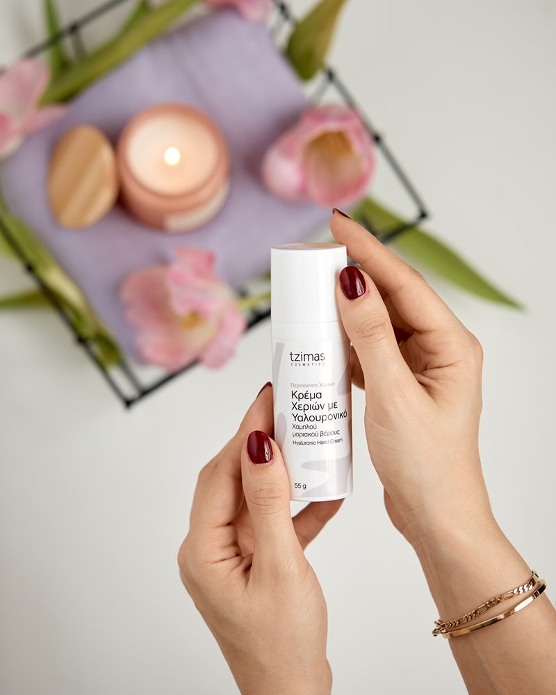Η «Κρέμα Χεριών με Υαλουρονικό» περιέχει υαλουρονικό οξύ χαμηλού μοριακού βάρους που διεισδύει αποτελεσματικότερα στην επιδερμίδα, προσφέρει βαθιά ενυδάτωση, μειώνει τις ρυτίδες και βελτιώνει αισθητά την υφή και την ελαστικότητα του δέρματος των χεριών (€ 8,80 – 55g)