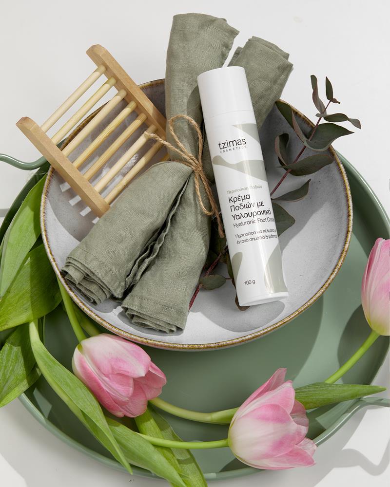 Η «Κρέμα Ποδιών με Υαλουρονικό» είναι ιδιαίτερα ευεργετική για πέλματα με έντονα σημάδια ξηρότητας. Περιέχει υαλουρονικό οξύ, ουρία και γλυκερίνη που δεσμεύουν την υγρασία στο δέρμα και γλυκολικό οξύ που απομακρύνει τα νεκρά κύτταρα (€ 9,50 – 100g).