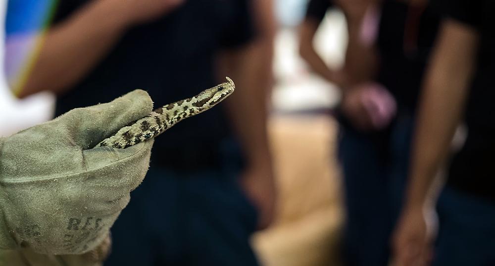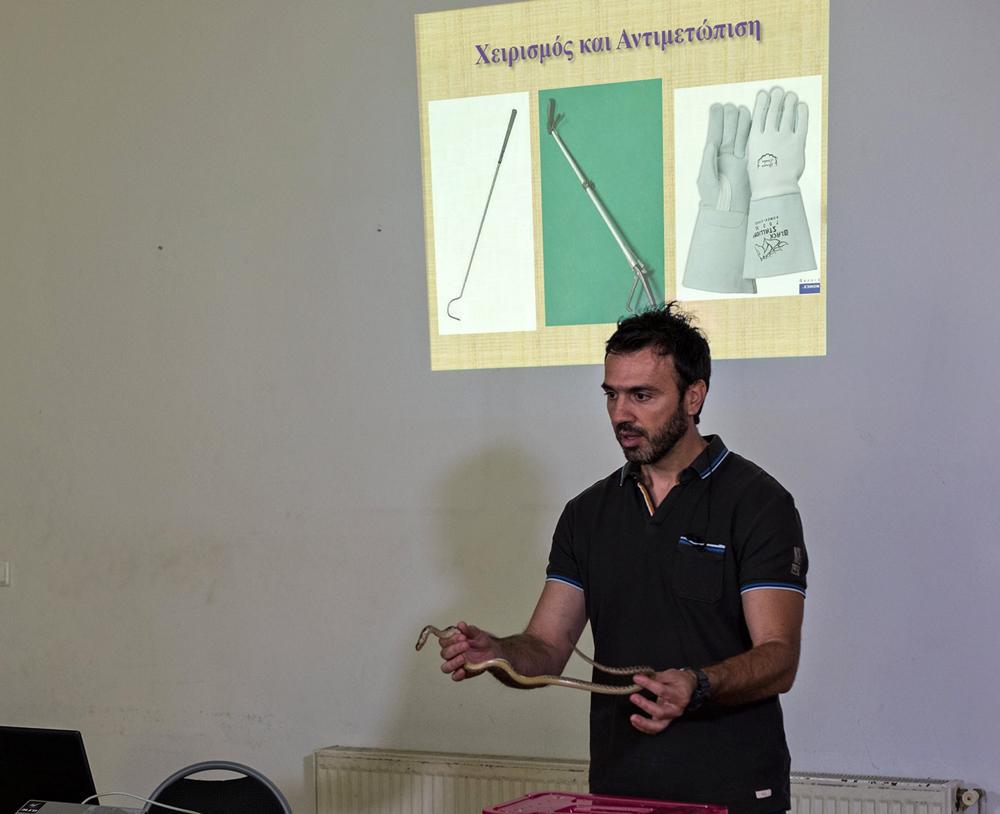 Στη συνέχεια, ο κ. Στραχίνης εστίασε συγκεκριμένα στα φίδια του νομού Θεσσαλονίκης και στα είδη που μπορεί να συναντήσει κανείς στον υπαίθριο χώρο του αεροδρομίου. Αναφέρθηκε στον ασφαλή χειρισμό τους, τους τρόπους απομάκρυνσής τους όταν αυτά βρεθούν σε εσωτερικούς χώρους και τις κατάλληλες ενέργειες σε περίπτωση δηλητηριώδους δήγματος.