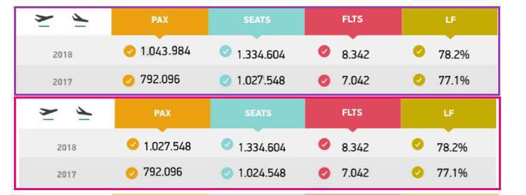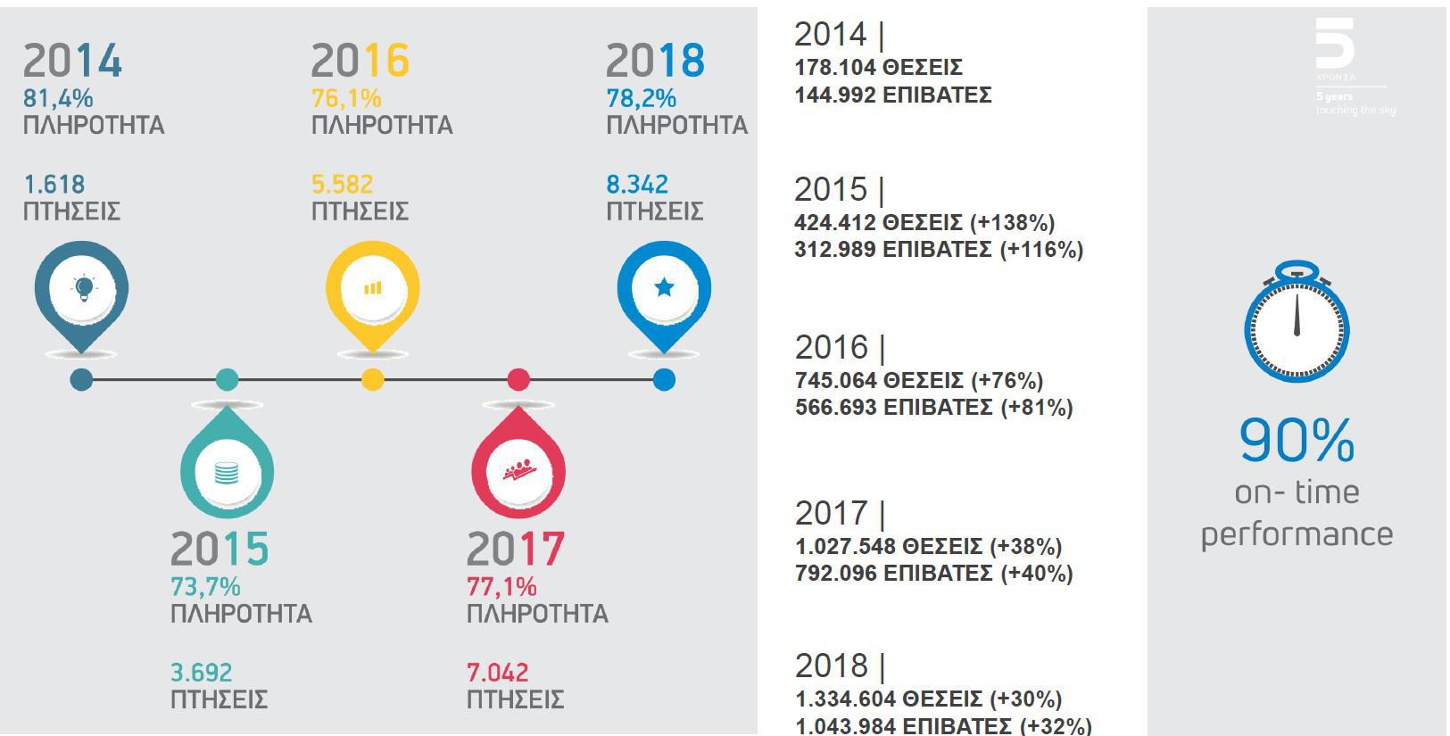 Συγκεκριμένα, το 2018, η εταιρία πραγματοποίησε 8.342 πτήσεις, προσφέροντας 1.334.604 θέσεις, σημειώνοντας αύξηση 30% σε σύγκριση με το 2017 και μεταφέροντας 1.043.984 επιβάτες (αύξηση 32% σε σύγκριση με το 2017), με ποσοστό πληρότητας 78,2%.