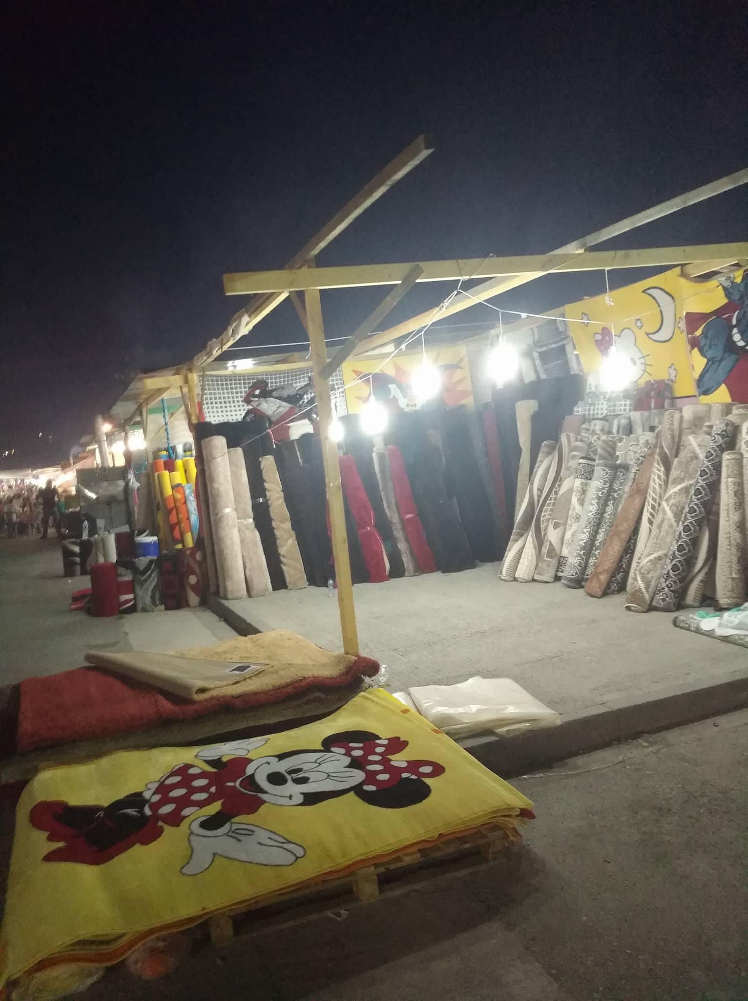 Σε μερικά στρέμματα συνωστίζονται και πωλούνται: Καλτσικά 12 ζεύγη πέντε ευρώ, σωβρακοφανέλες ισοθερμικές για το κρύο του χειμώνα, σινδόνια με παραστάσεις λουλουδάτες και στις αυτοσχέδιες γκαλερί, Παναγιές με το Χριστό ζωγραφισμένες συνομήλικες με Κείνον, λέβητες θέρμανσης και χρυσόψαρα σε γυάλες. Κορίτσια και αγόρια από γειτονικά χωριά δοκιμάζουν στην ψύχρα τα ρούχα του χειμώνα. Πετσετέ σώβρακα πλάι σε καραμπίνες. Γονείς ψωνίζουν πιατικά για προίκες. Σπιτικά στήνονται στο πιτς φυτίλι. Ο κόσμος ψωνίζει λιγότερο από παλιά. Πίσω από τους πάγκους οι πωλητές είναι έρμοι μετανάστες. Από κάθε γωνιά της γης.