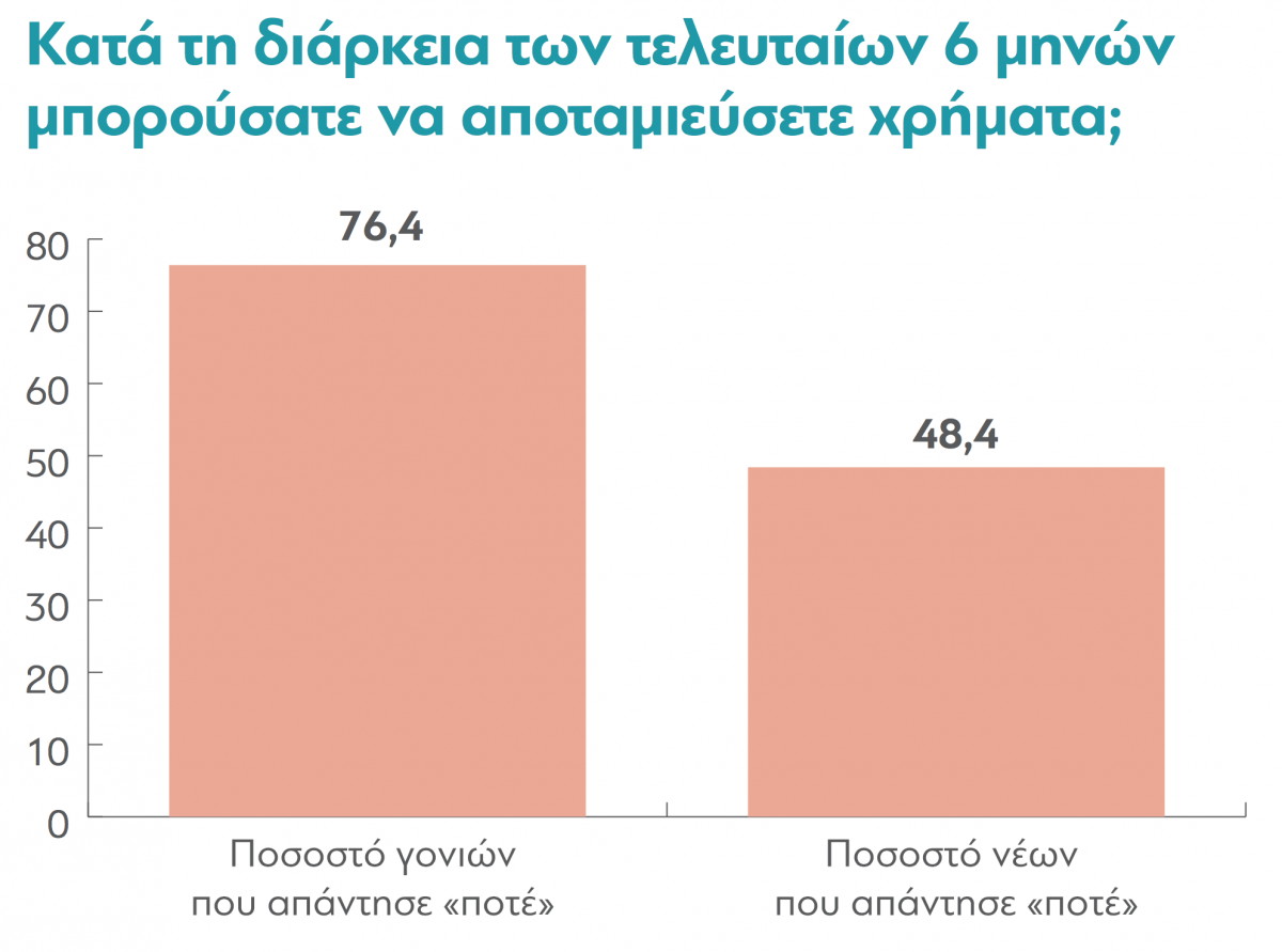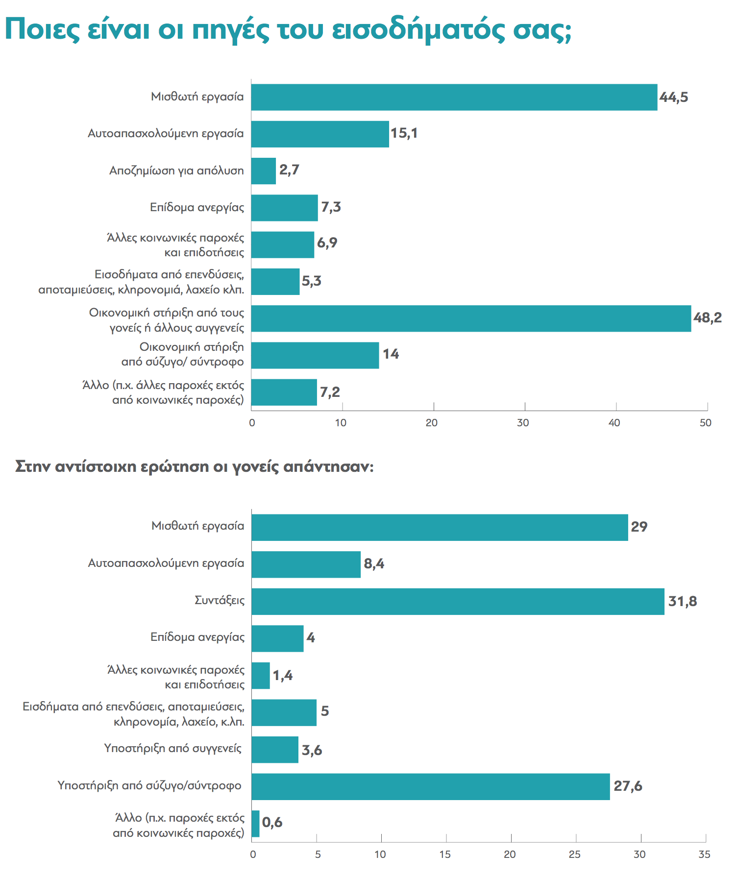 38% των νέων ζουν στην Αθήνα. 60% των νέων είναι ελεύθεροι. Μόνο 22% έχουν παιδιά. Οι Έλληνες νέοι δηλώνουν λίγο περισσότερο αριστεροί, πολύ λιγότερο θρησκευόμενοι (31% έναντι 54%) από τους γονείς τους. Έχουν λίγο καλύτερο επίπεδο εκπαίδευσης από αυτούς, αλλά, παραδόξως, συμμετέχουν λιγότερο σε εθελοντικές ή συλλογικές δράσεις από ό,τι οι γονείς τους (πλην των πολιτικών δράσεων), εμπιστεύονται λιγότερο τους θεσμούς και συμμετέχουν λιγότερο σε πολιτιστικά δρώμενα (43% έναντι 57%). Ενδιαφέρον είναι και το οικονομικό τους προφίλ: 48% των Ελλήνων νέων δηλώνουν ως πηγή εισοδήματός τους «οικονομική στήριξη από γονείς ή άλλους συγγενείς». Είναι η πιο συχνή πηγή εσόδων –πιο συχνή από τη «μισθωτή εργασία», που είναι στο 45%.
