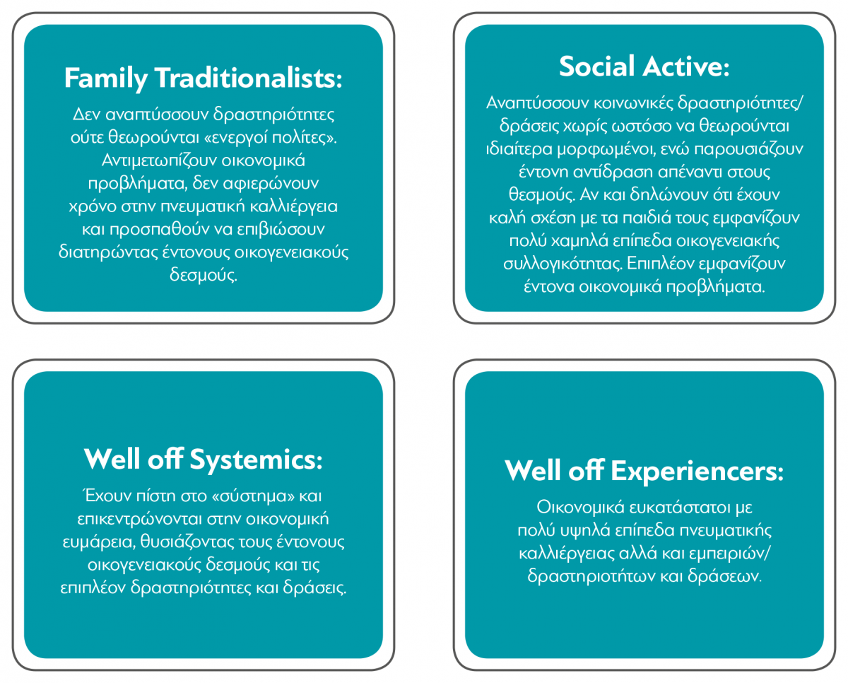 Οι ερευνητές της MRB έκαναν μια πρώτη απόπειρα επεξεργασίας των αποτελεσμάτων, φιλοδοξώντας να ταυτοποιήσουν ευδιάκριτες “φυλές” ανάμεσα στους Έλληνες γονείς και τα παιδιά τους. Οι ερευνητές ταυτοποίησαν τέσσερις διακριτές ομάδες αναλύοντας τις απαντήσεις τους σε εννέα κατηγορίες ερωτήσεων, από αυτές που είχαν να κάνουν με τη συμμετοχή σε συλλογικές δράσεις και την εμπιστοσύνη στους θεσμούς, μέχρι αυτές που είχαν να κάνουν με τις οικογενειακές σχέσεις και τις απόψεις περί οικονομικής κατάστασης των ερωτηθέντων. Οι ερευνητές ταυτοποίησαν τις τέσσερις κατηγορίες πρώτα στους γονείς, και μετά χαρτογράφησαν τις αντίστοιχες κατηγορίες και στα παιδιά. Προέκυψαν ενδιαφέροντα συμπεράσματα. Οι κατηγορίες αυτές ορίστηκαν ως «Παραδοσιακοί» (“Family traditionalists”), «Κοινωνικά ενεργοί» (Socially Active), «Καλοβαλμένοι συστημικοί» (“Well off systemics”) και «Καλοβαλμένοι προοδευτικοί» (“Well off experiencers”). Αυτές οι ειδικές ομάδες έχουν κάποια χαρακτηριστικά τα οποία μπορούν να συνοψιστούν στα εξής: