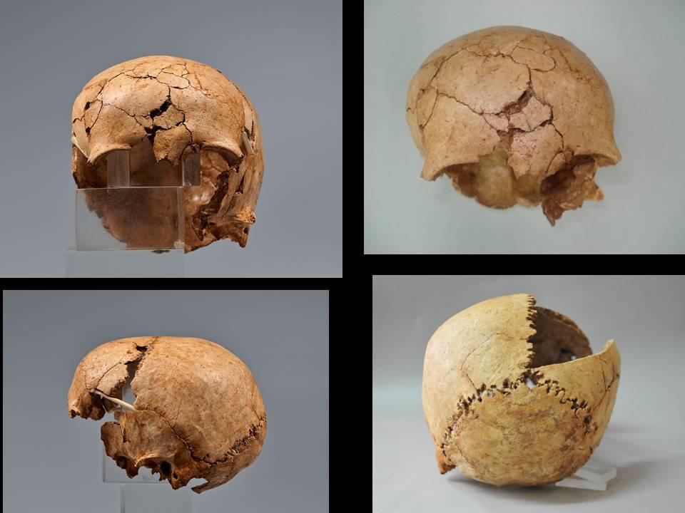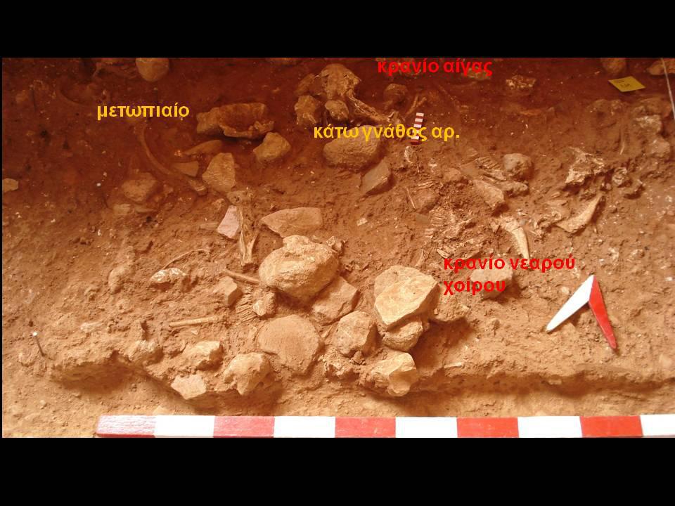 το κρανίο της νεαρής κοπέλας ανάμεσα σε κρανία ζώων, όχι όμως ακέραιο. Ήταν διαμελισμένο, όπως όλα τα υπόλοιπα οστά. Ανοιγμένο ακριβώς από τις ραφές, αφού προηγήθηκε κόψιμο με ξίφος στο δεξί βρεγματικό και το ινιακό, και διασκορπισμένο ανάμεσα σε κρανία ζώων (τουλάχιστον δύο αιγών και ενός χοίρου). Είναι αλήθεια. Το ανθρώπινο κρανίο είχε διαμελιστεί ίσως και το υπόλοιπο σώμα και κατά τον ίδιο τρόπο με των ζώων. Τα δυο βρεγματικά, το ινιακό και το μετωπιαίο που εχουν έρθει στο φως δεν ειναι κομματιασμένα, αλλά ανοιγμένα από τις φυσικές τους ραφές και διασκορπισμένα. Κοντά τους και η δεξιά κάτω σιαγόνα. Η εικόνα σοκάρει» τόνιζε στη διάρκεια της εισήγησής της στην κατάμεστη αίθουσα «Μανόλης Ανδρόνικος» του Μουσείου η ομιλήτρια.