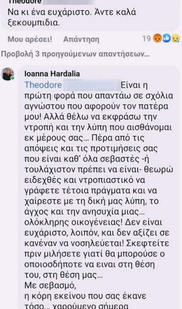 Σε σχόλιο χρήστη στο Facebook, απάντησε η Ιωάννα Χαρδαλιά, κόρη του υφυπουργού Πολιτικής Προστασίας.