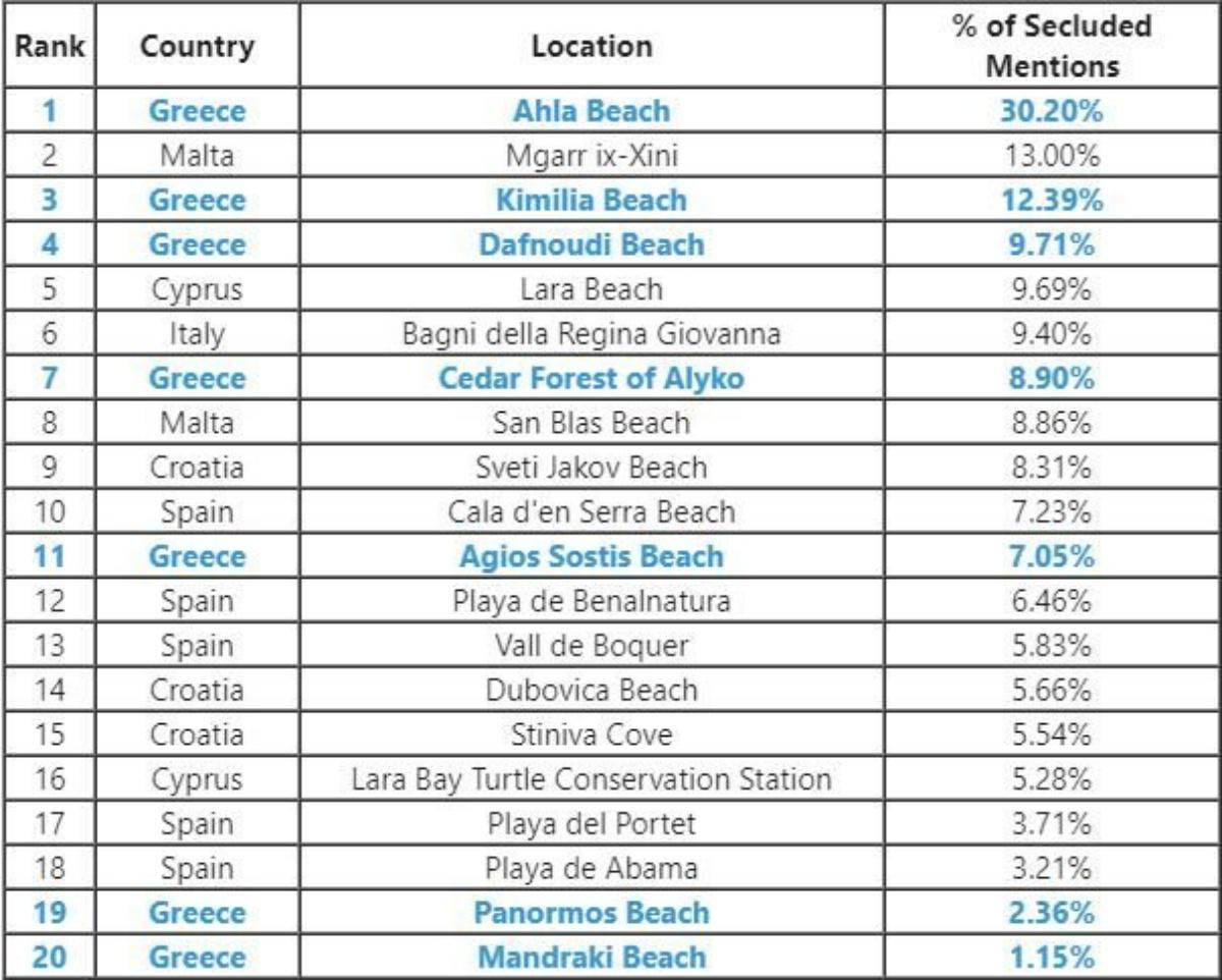 Τις περισσότερες συμμετοχές στη λίστα με τις πιο απομονωμένες παραλίες στην Ευρωπαϊκή Ένωση καταλαμβάνει η Ελλάδα, καταλαμβάνοντας συνολικά επτά από τις 20 θέσεις, μεταξύ αυτών και την πρώτη με την παραλία Άχλα της Άνδρου.
