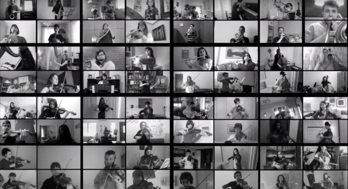 59 μέλη της Συμφωνικής Ορχήστρας Νέων του Μεγάρου Μουσικής Θεσσαλονίκης - MOYSA και ο μαέστρος της ορχήστρας Θοδωρής Παπαδημητρίου, συντονίζονται και αποχαιρετούν μουσικά την κατάσταση.
