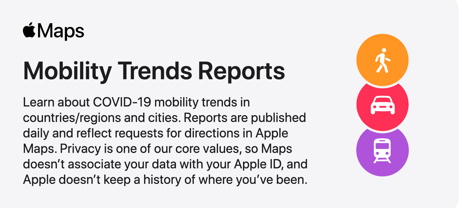 Ακολουθώντας το παράδειγμα της Google, η Apple δημιούργησε και αυτή ένα online εργαλείο που καταγράφει τις αλλαγές στις μετακινήσεις και συνήθειες των ανθρώπων, μετά τα περιοριστικά μέτρα κοινωνικής αποστασιοποίησης εξαιτίας της πανδημίας Covid-19. Στόχος της εταιρείας είναι να βοηθήσει τις αρχές δημόσιας υγείας να βεβαιώσουν κατά πόσο ο πληθυσμός τηρεί τα μέτρα.