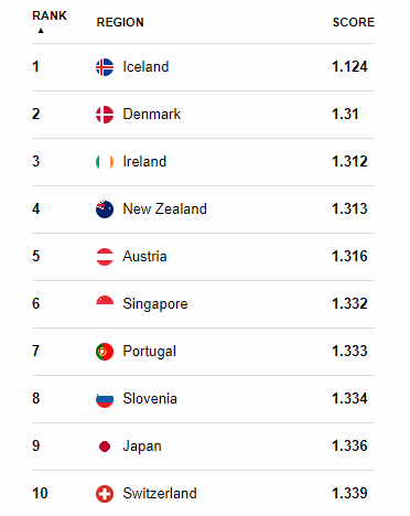 Η Ισλανδία παρέμεινε η πιο ειρηνική χώρα στον κόσμο από την πρώτη δημοσίευση της μελέτης το 2008.Κατατάσσεται επίσης ως η τρίτη πιο ευτυχισμένη χώρα στον κόσμο, μετά τη Φινλανδία και τη Δανία.