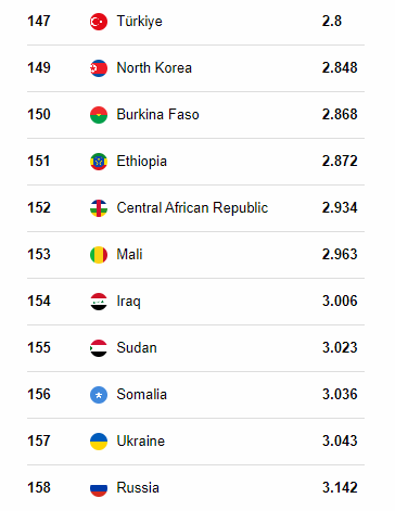Ο ετήσιος παγκόσμιος δείκτης ειρήνης 2023 καταρτίστηκε από το Ινστιτούτο Οικονομίας και Ειρήνης.