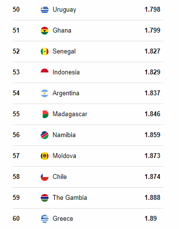 Η Ελλάδα κατέλαβε την 60η θέση, πίσω από τις Γκάνα, Σενεγάλη, Ινδονησία και Γκάμπια.
