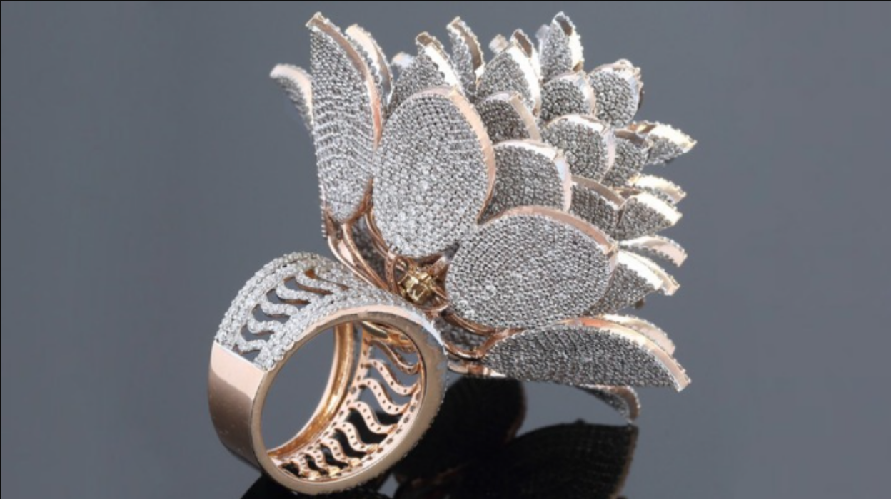 Ένα δαχτυλίδι σε σχήμα λουλουδιού, διακοσμημένο με περισσότερα από 12.000 διαμάντια έκανε την είσοδό του στο βιβλίο των παγκόσμιων ρεκόρ Γκίνες, όμως ο δημιουργός του, ένας Ινδός κοσμηματοπώλης, ηλικίας 25 ετών, είναι τόσο περήφανος για αυτό που δεν προτίθεται ακόμη να το πουλήσει.