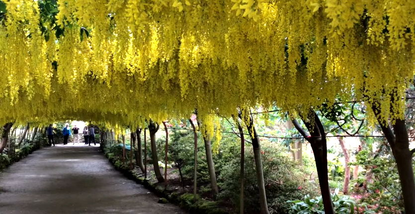 Χρυσά λουλούδια ανοίγουν σ’ αυτά τα δέντρα, σαν καταρράκτης υποκλίνονται και δημιουργούν ένα τούνελ 55 μέτρων – το μεγαλύτερο, σε βρετανικό κήπο- με ανθοφόρα οροφή.