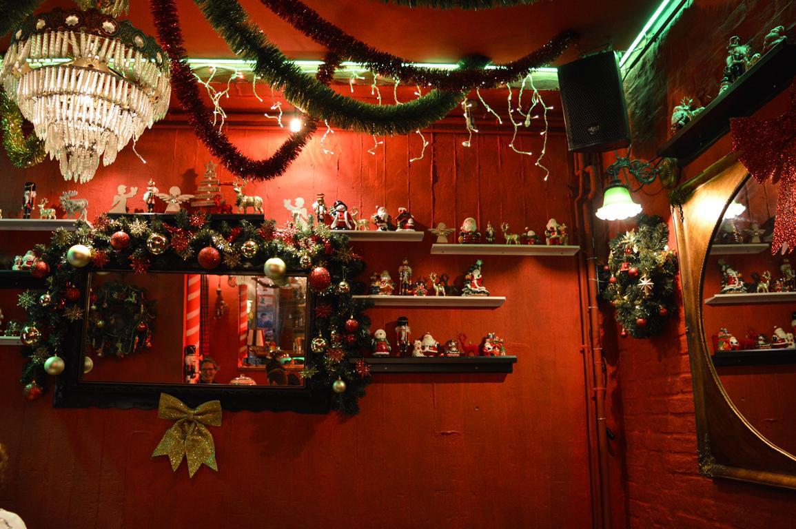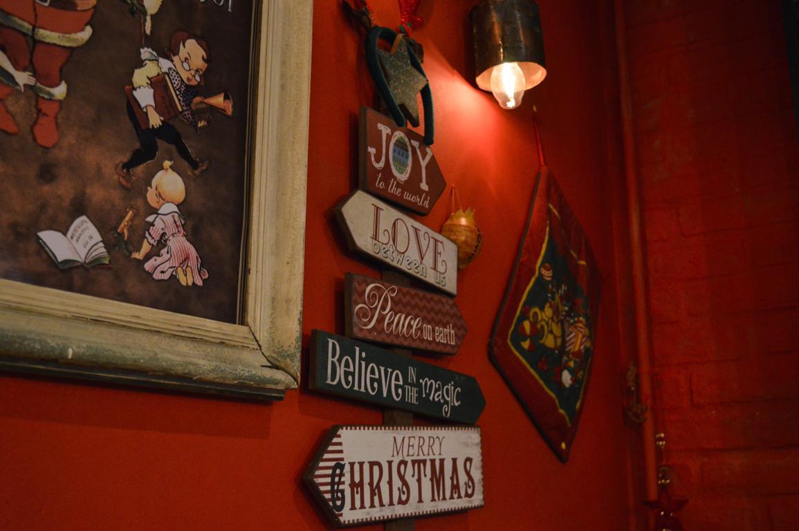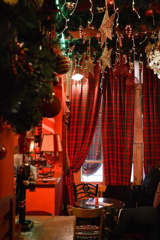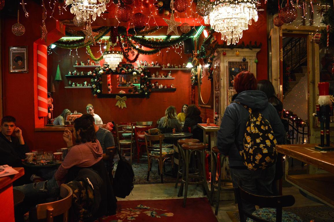 Στους τοίχους παλιές χριστουγεννιάτικες αφίσες και διαφημίσεις από εποχές αθωότητας, οι κούπες όλες γιορτινές, μοναδικές, η οροφή ένα πανδαιμόνιο χρυσόσκονης και λάμψης που βοηθά το όνειρο να ζωντανέψει. Τα στοιχεία του παραμυθιού είναι διάσπαρτα στο χώρο. Μολυβένιοι στρατιώτες έτοιμοι να ζωντανέψουν, αλογάκια που το έσκασαν από τον κόσμο των μεγάλων παραμυθάδων, άγγελοι που κάθισαν δίπλα σου να ξαποστάσουν. Εκατοντάδες μικρολεπτομέρειες τριγύρω σε προετοιμάζουν για την ωραιότερη περίοδο του χρόνου και σε κάνουν να θέλεις να βουλιάξεις για πάντα σ’ αυτή την ωραία παραίσθηση. Γιορτινές καρό κουρτίνες ασορτί με τις ποδιές των κοριτσιών που σερβίρουν ζωντανεύουν την αίσθηση του μαγικού αυτού χώρου. Ένας ουρανός με αστέρια πάνω από το κεφάλι σου, δεκάδες πολύχρωμες τρέσες, μαγικά κουτιά, μικρές γυάλινες μπάλες που τις κουνάς και χιονίζει, χριστουγεννιάτικα ελαφάκια σε όλες τις εκδοχές και φυσικά μελωδίες υπέροχες που λειτουργούν σαν soundtrack.
