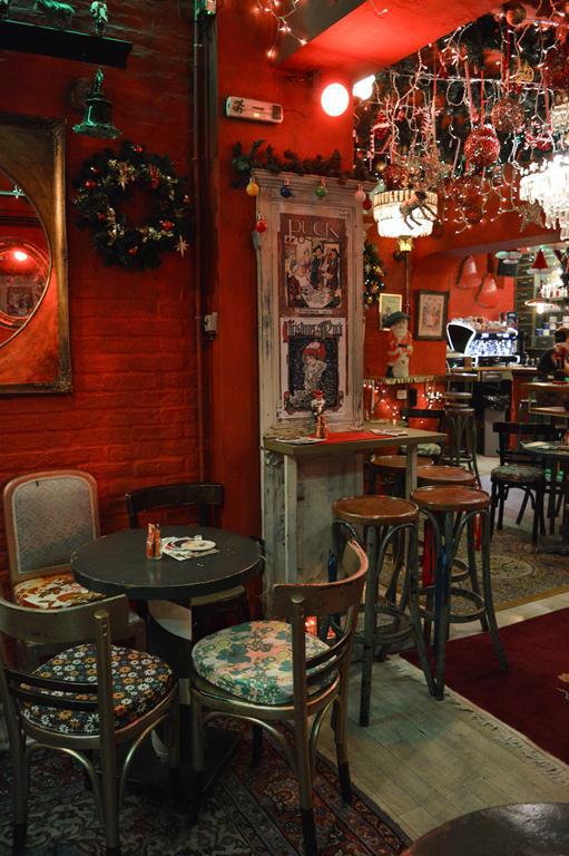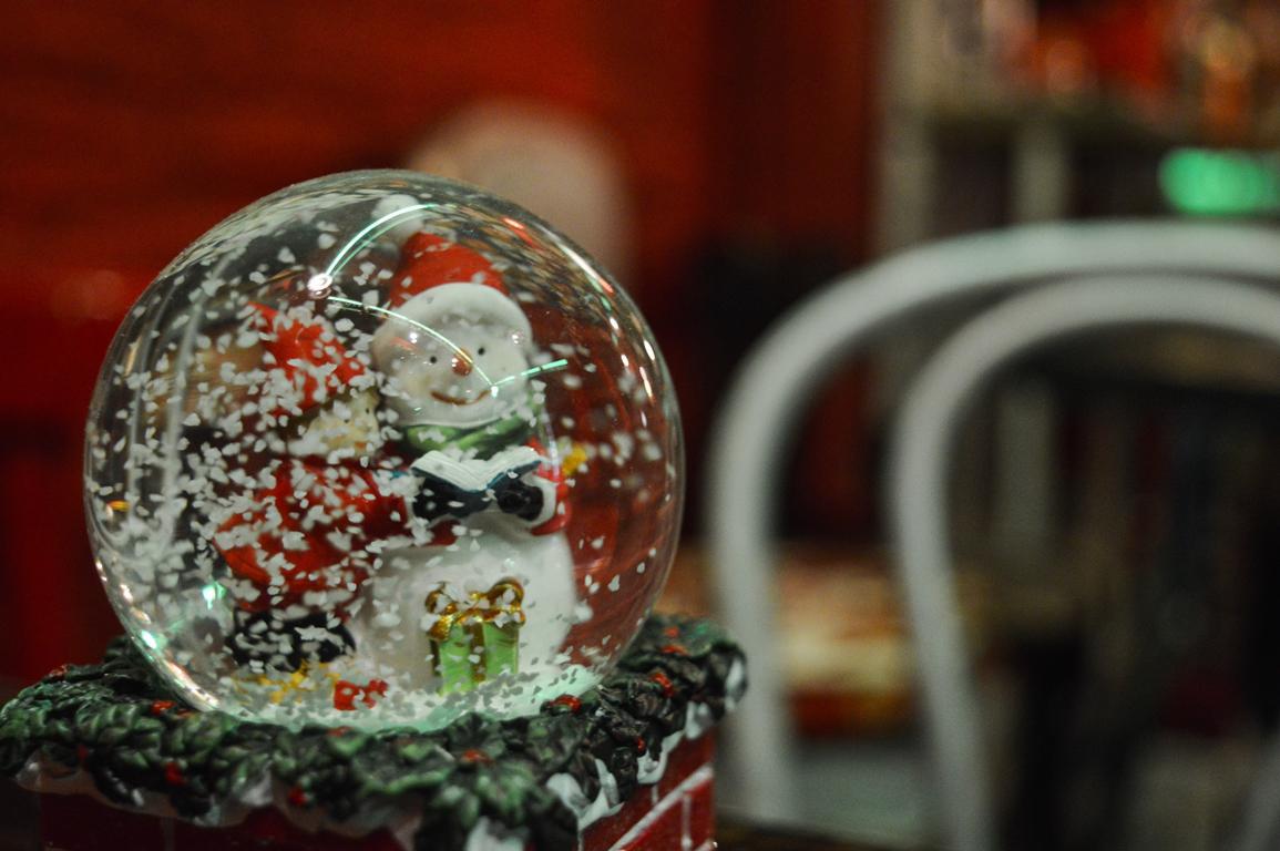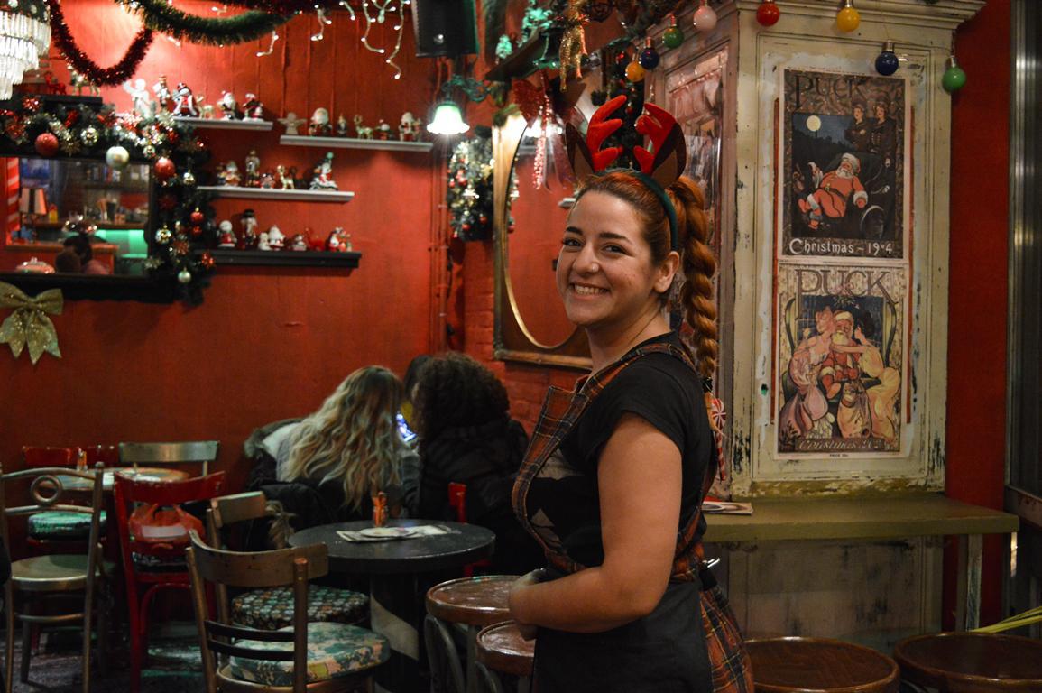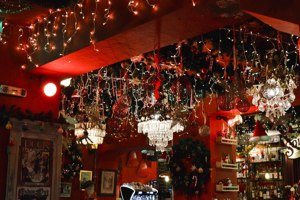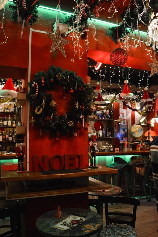Στους τοίχους παλιές χριστουγεννιάτικες αφίσες και διαφημίσεις από εποχές αθωότητας, οι κούπες όλες γιορτινές, μοναδικές, η οροφή ένα πανδαιμόνιο χρυσόσκονης και λάμψης που βοηθά το όνειρο να ζωντανέψει. Τα στοιχεία του παραμυθιού είναι διάσπαρτα στο χώρο. Μολυβένιοι στρατιώτες έτοιμοι να ζωντανέψουν, αλογάκια που το έσκασαν από τον κόσμο των μεγάλων παραμυθάδων, άγγελοι που κάθισαν δίπλα σου να ξαποστάσουν. Εκατοντάδες μικρολεπτομέρειες τριγύρω σε προετοιμάζουν για την ωραιότερη περίοδο του χρόνου και σε κάνουν να θέλεις να βουλιάξεις για πάντα σ’ αυτή την ωραία παραίσθηση. Γιορτινές καρό κουρτίνες ασορτί με τις ποδιές των κοριτσιών που σερβίρουν ζωντανεύουν την αίσθηση του μαγικού αυτού χώρου. Ένας ουρανός με αστέρια πάνω από το κεφάλι σου, δεκάδες πολύχρωμες τρέσες, μαγικά κουτιά, μικρές γυάλινες μπάλες που τις κουνάς και χιονίζει, χριστουγεννιάτικα ελαφάκια σε όλες τις εκδοχές και φυσικά μελωδίες υπέροχες που λειτουργούν σαν soundtrack.