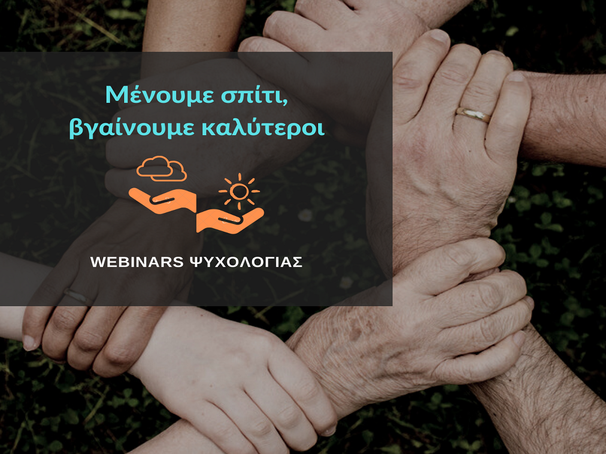 Οι ενότητες των webinars «Μένουμε σπίτι, βγαίνουμε καλύτεροι» σχεδιάστηκαν για να καλύπτουν ένα ευρύ φάσμα προβλημάτων και αναγκών προσφέροντας σε όλους υποστήριξη, συμβουλές, εργαλεία διαχείρισης άγχους και ένα χώρο έκφρασης και συζήτησης για όλα αυτά που μας απασχολούν.