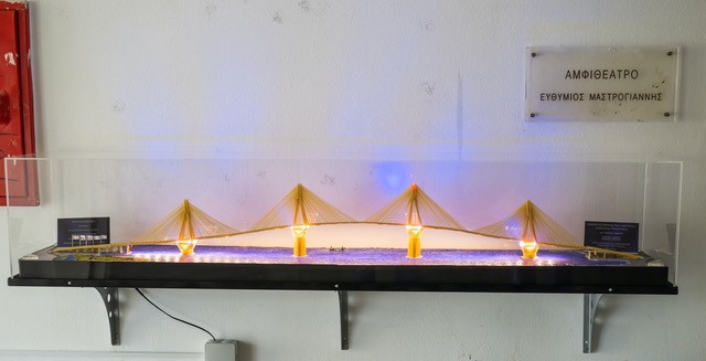 Όπως εξηγεί στο ΑΠΕ-ΜΠΕ ο Σωτήρης Πεννιάς, δευτεροετής φοιτητής κατά την κατασκευή της γέφυρας και τριτοετής πλέον, η γέφυρα έχει διαστάσεις 30 εκατοστά επί 2 μέτρα επί 40 εκατοστά και ζυγίζει 25 κιλά χωρίς την προθήκη και 32 αν συνυπολογιστεί και αυτή. «Η γέφυρα σχεδιάστηκε σε κλίμακα 1:750 (ένα προς 750). Ωστόσο, δεν ήταν εύκολο να κατασκευαστεί σε αυτή την κλίμακα, καθώς το μήκος της θα έφτανε τα τεσσεράμισι μέτρα. Έτσι κρατήσαμε τους πυλώνες σε κλίμακα 1:750 και φτιάξαμε το κατάστρωμα μικρότερο, σε κλίμακα 1:1500. Κατασκευάσαμε τη γέφυρα από το ύψος της θάλασσας και πάνω, δηλαδή όχι τα θεμέλιά της, με τις λεπτομέρειες του οδοστρώματος και του καταστρώματος, τα πεζοδρόμια και τις καλωδιώσεις της πραγματικής» σημειώνει.