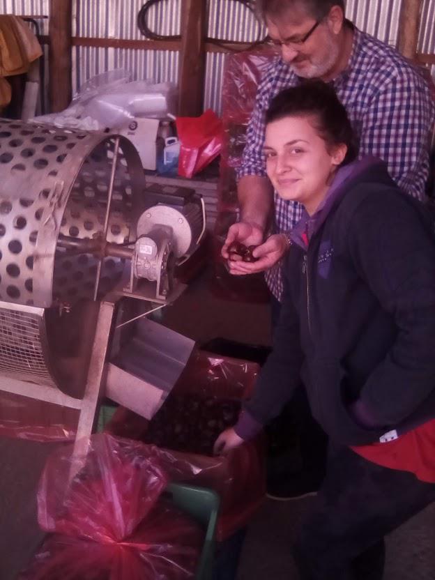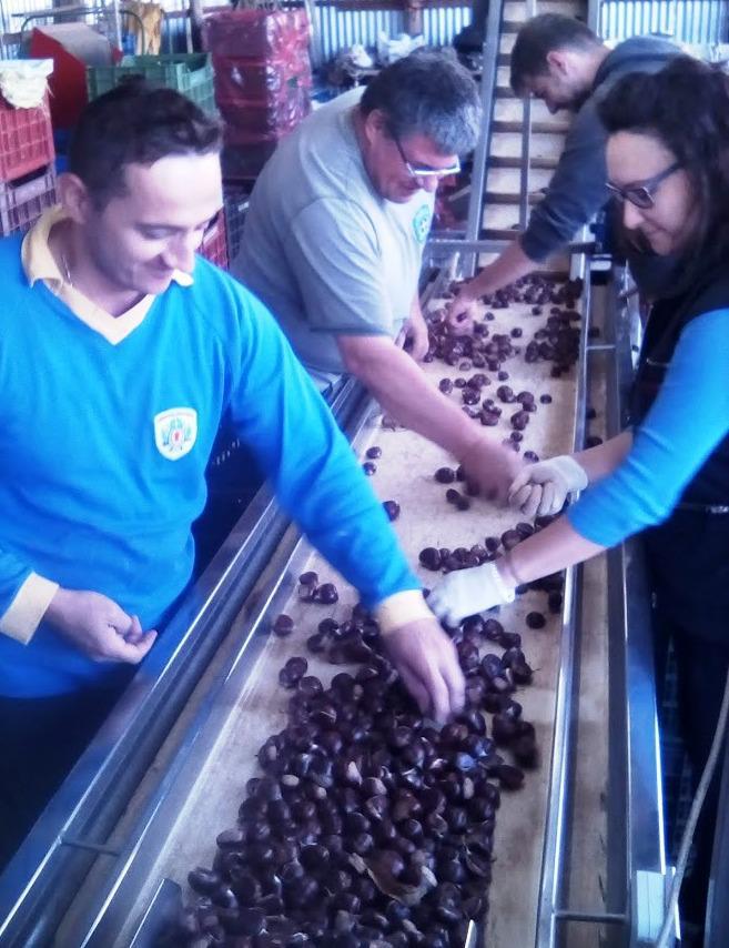 Το μάζεμα δεν είναι εύκολη εργασία, καθώς το έδαφος έχει μεγάλη κλίση και συλλέγεται από το «τζιουνάτο» χαλί της κάθε καστανιάς. Για αυτό και οι φωνές, τα πειραχτά και τα καλαμπούρια είναι απαραίτητα και όπως λέει και ο Γιώργος Πολυχρός «Η κουβέντα – κουβέντα και η δουλειά – δουλεία», που μόλις έφτασε στο κτήμα, για να φορτώσει τα σακιά στο αγροτικό και να τα κατεβάσει στο διαλογητήριο που βρίσκεται στην Σκοτίνα. Εκεί γίνεται ο διαχωρισμός με βάση το μέγεθος, αλλά και τα γερά από τα σχισμένα. Τα σχισμένα πάνε άμεσα για να μας δώσουν τα ψημένα κάστανα, ένα από τα υγιεινότερα σνάκ για μικρούς και μεγάλους. Τα γερά πάνε για τα ψυγεία ώστε να χρησιμοποιηθούν αργότερα.