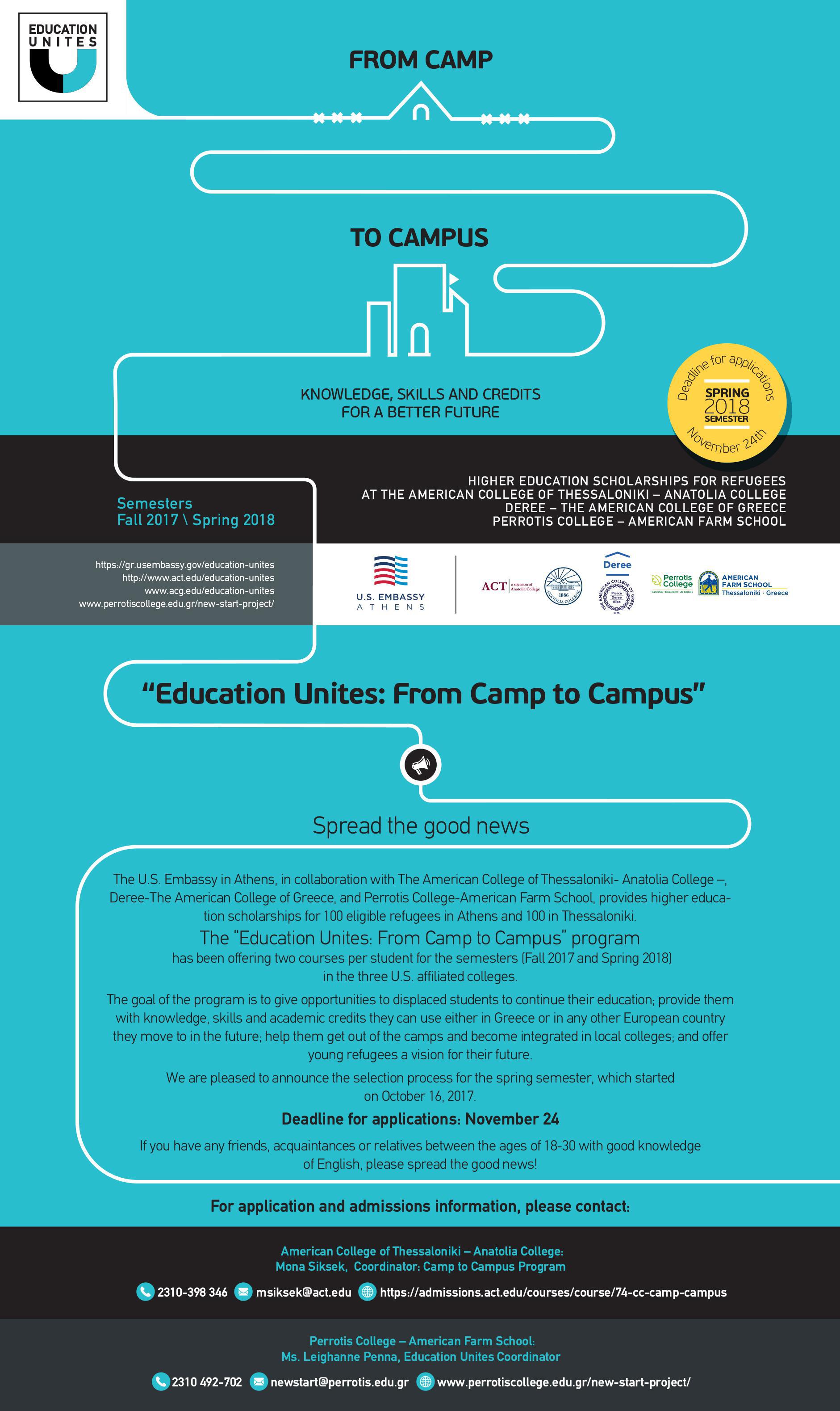 Την πρώτη εβδομάδα του Οκτωβρίου ξεκίνησε και ουσιαστικά το πρόγραμμα υποτροφιών “Education Unites: From Camp to Campus,” που οργανώνει η Πρεσβεία των Η.Π.Α. στην Αθήνα, σε συνεργασία με το Αμερικανικό Κολλέγιο Θεσσαλονίκης -Anatolia College, το Deree -Αμερικανικό Κολλέγιο Ελλάδος και το Perrotis College -Αμερικανική Γεωργική Σχολή. Ύστερα από συνεντεύξεις και εξέταση περισσότερων από 400 αιτήσεων προσφύγων και αιτούντων άσυλο που υποβλήθηκαν στα αμερικανικά εκπαιδευτικά ιδρύματα που συνεργάστηκαν στο πρόγραμμα, 78 συνολικά πρόσφυγες ξεκίνησαν τα μαθήματά τους για το πρώτο εξάμηνο της ακαδημαϊκής χρονιάς 2017-2018.