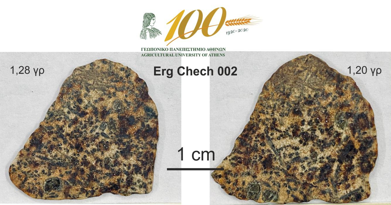 Ο κ.Μπαζιώτης και οι συνάδελφοί του έχουν στα χέρια τους δύο κομμάτια του, 1,3 γραμμαρίων το καθένα. «Ο μετεωρίτης Erg Chech 002, βρέθηκε τον Μάιο του 2020 στην έρημο της νότιας Αλγερίας, στη περιοχή Erg Chech. Η συνολική μάζα υλικού που έχει ανακτηθεί έως σήμερα ανέρχεται σε 31,78 κιλά. Τα δείγματα που έχουν ανακτηθεί στερούνται του χαρακτηριστικού διαγνωστικού γνωρίσματος για μετεωρίτες, του φλοιού σύντηξης. Χαρακτηρίζονται ως άδρο-κοκκώδη με ερυθρωπή απόχρωση που διακόπτεται από πρασινωπούς κρυστάλλους του ορυκτού πυρόξενος, με μέγεθος που πολλές φορές φθάνει τα 9 εκατοστά -κάτι επίσης πολύ σπάνιο», όπως είπε.