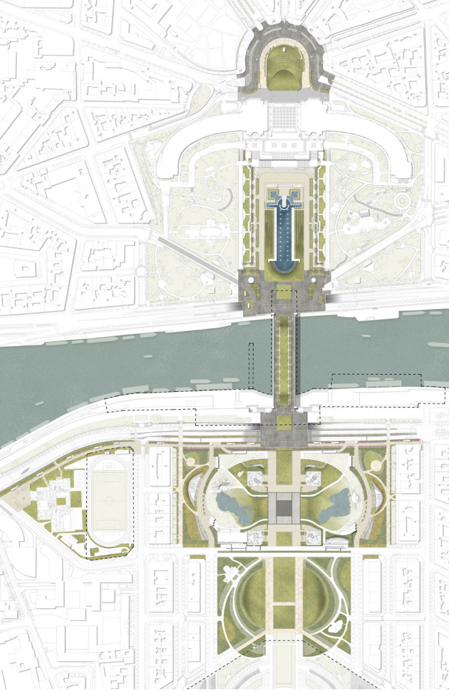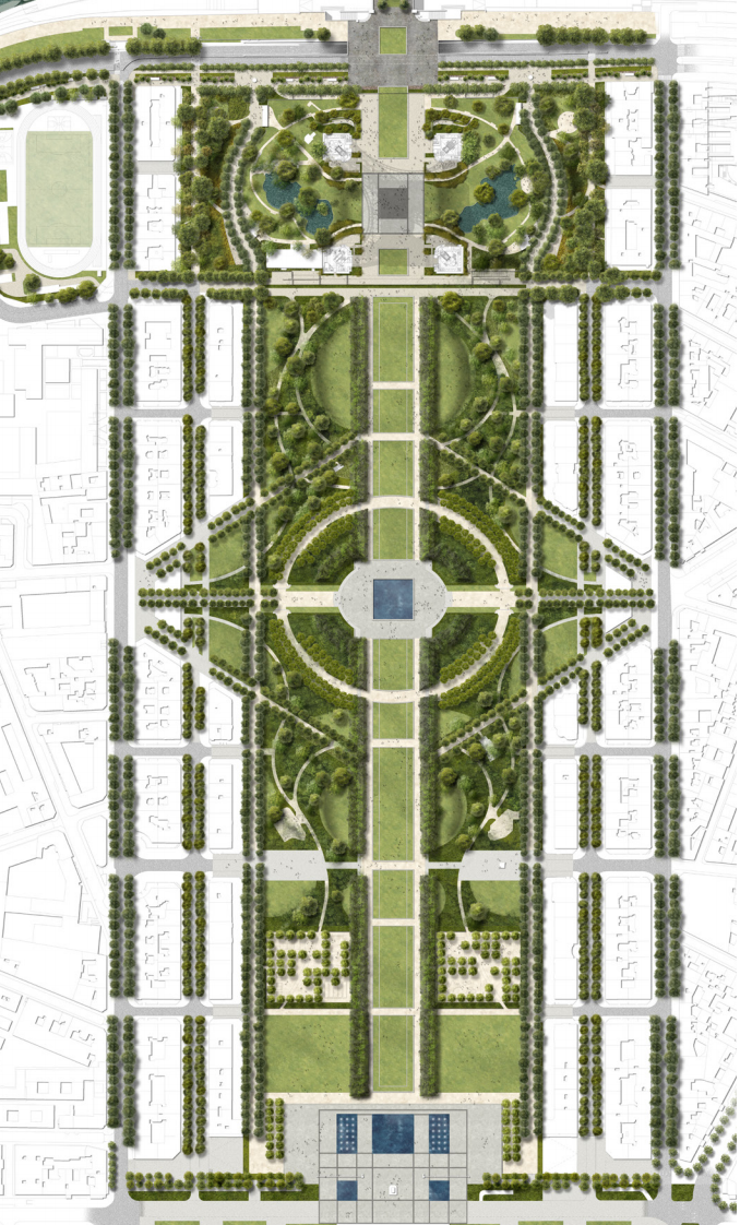 Δύο ιστορικής σημασίας τυπολογίες τοπίου συνδυάζει το σχέδιο του βρετανικού γραφείου που επελέγη στον διαγωνισμό: τους κλασικούς γαλλικούς κήπους, οι οποίοι χαρακτηρίζονται από μεγάλους άξονες που εκφράζουν ισχύ και τους γαλλικούς γραφικούς κήπους, οι οποίοι είναι χώροι καλλιτεχνικών πειραματισμών.
