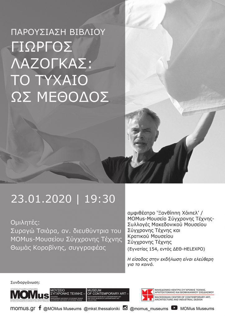 Η παρουσίαση του βιβλίου του Γιώργου Λαζόγκα «Το Τυχαίο ως μέθοδος» θα πραγματοποιηθεί την Πέμπτη 23 Ιανουαρίου 2020, στο MOMus-Μουσείο Σύγχρονης Τέχνης-Συλλογές Μακεδονικού Μουσείου Σύγχρονης Τέχνης και Κρατικού Μουσείου Σύγχρονης Τέχνης στη Θεσσαλονίκη. Ομιλητές θα είναι οι: Συραγώ Τσιάρα, αν. διευθύντρια του MOMus-Μουσείου Σύγχρονης Τέχνης, Θωμάς Κοροβίνης, συγγραφέας. Η εκδήλωση πραγματοποιείται σε συνδιοργάνωση με το Μακεδονικό Κέντρο Σύγχρονης Τέχνης, Αρχιτεκτονικής και Βιομηχανικού Σχεδιασμού.