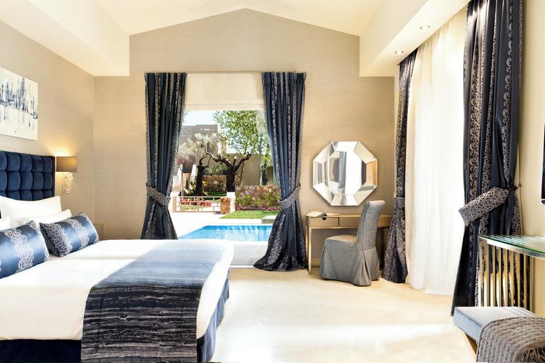 Οι ειδικά διαμορφωμένες σουίτες είναι ενός, δύο ή τριών δωματίων με ξεχωριστό σαλόνι και όλες διαθέτουν κήπο ή μπαλκόνι με υπέροχη θέα στη θάλασσα, τη μαρίνα ή τους πράσινους κήπους του ξενοδοχείου. Από τις σουίτες των 55 τ.μ. έως την άνεση των 145 τ.μ., οι επιλογές καλύπτουν κάθε οικογένεια, ενώ διατίθενται ακόμη επιλογές με ιδιωτική θερμαινόμενη πισίνα, μαρμάρινα πατώματα και αποκλειστικές παροχές.