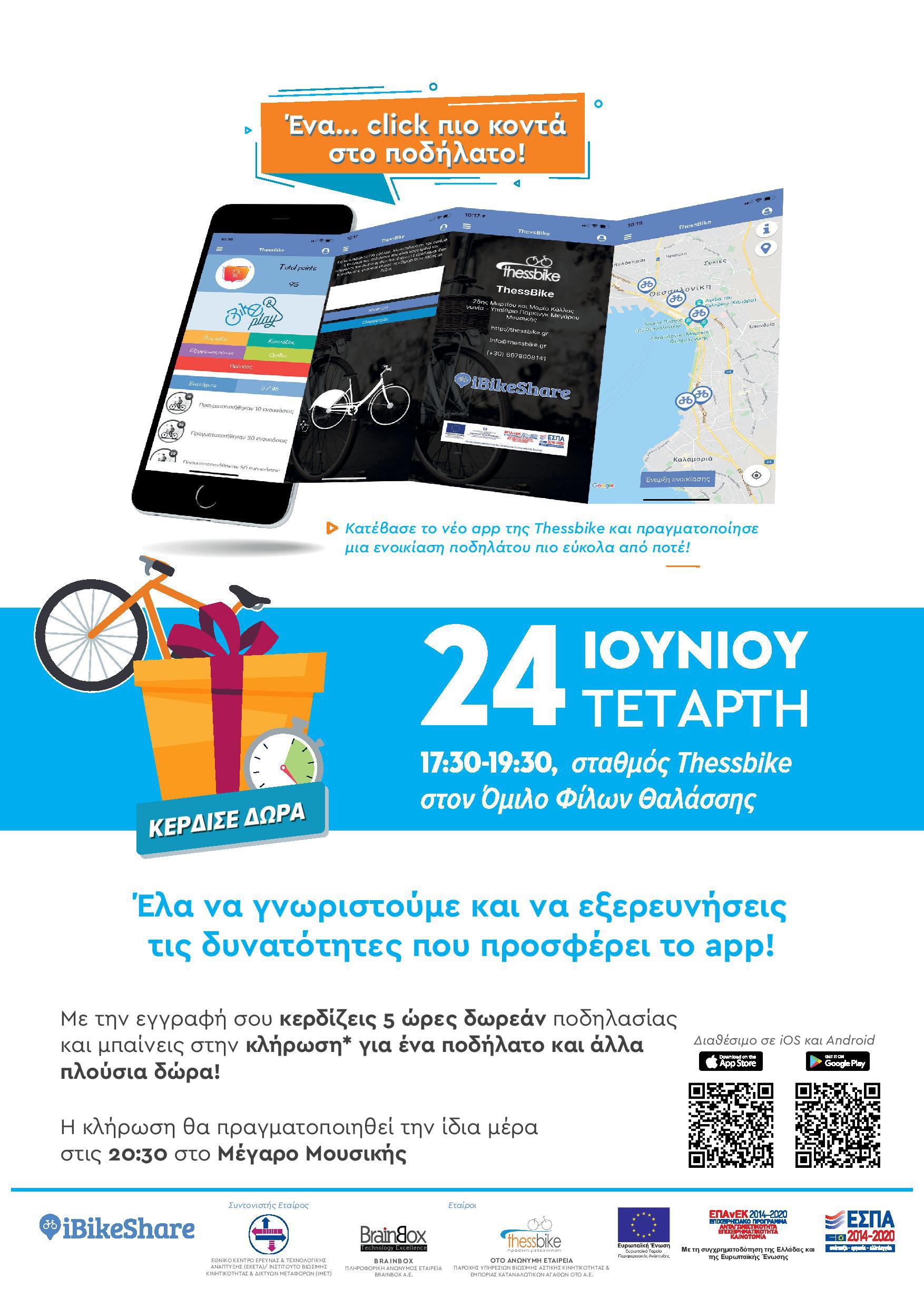 Όσοι εγκαταστήσουν την εφαρμογή στο κινητό τους θα λάβουν δώρο 5 ώρες ποδηλασίας και θα συμμετέχουν στην κλήρωση για ένα ποδήλατο και άλλα πλούσια δώρα προώθησης της χρήσης του ποδηλάτου από τους πολίτες. Η κλήρωση θα πραγματοποιηθεί την Τετάρτη 24 Ιουνίου 2020 στις 20:30 στο Μέγαρο Μουσικής Θεσσαλονίκης.