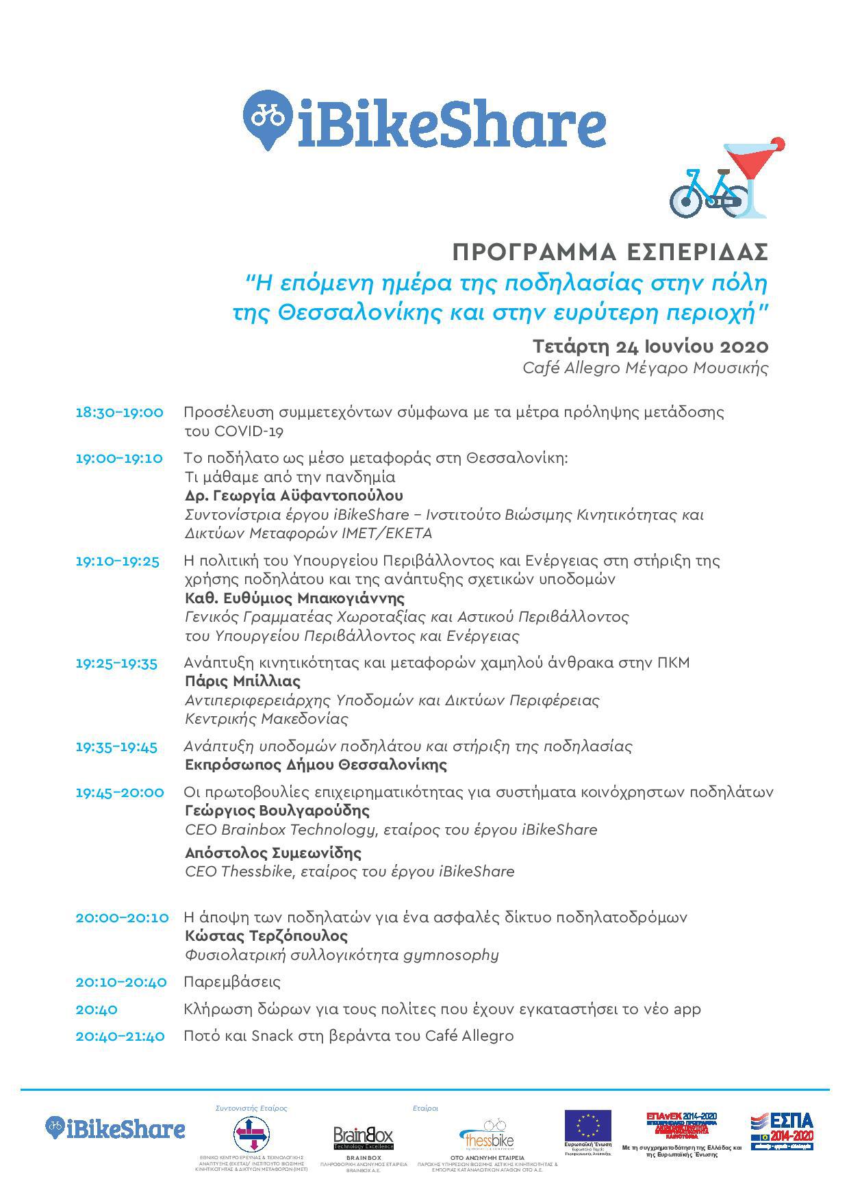 To Ινστιτούτο Βιώσιμης Κινητικότητας και Δικτύων Μεταφορών του Εθνικού Κέντρου Έρευνας και Τεχνολογικής Ανάπτυξης (ΕΚΕΤΑ-ΙΜΕΤ), συντονιστής του έργου iBikeShare και οι εταίροι του έργου, Brainbox A.E. και ΟΤΟ Α.Ε., που λειτουργούν το σύστημα κοινόχρηστων ποδηλάτων στη Θεσσαλονίκη διοργανώνουν την Τετάρτη 24 Ιουνίου 2020, στις 19:00, στο café Allegro στο Μέγαρο Μουσικής εσπερίδα με θέμα «Η επόμενη μέρα της ποδηλασίας στην πόλη της Θεσσαλονίκης και στην ευρύτερη περιοχή».